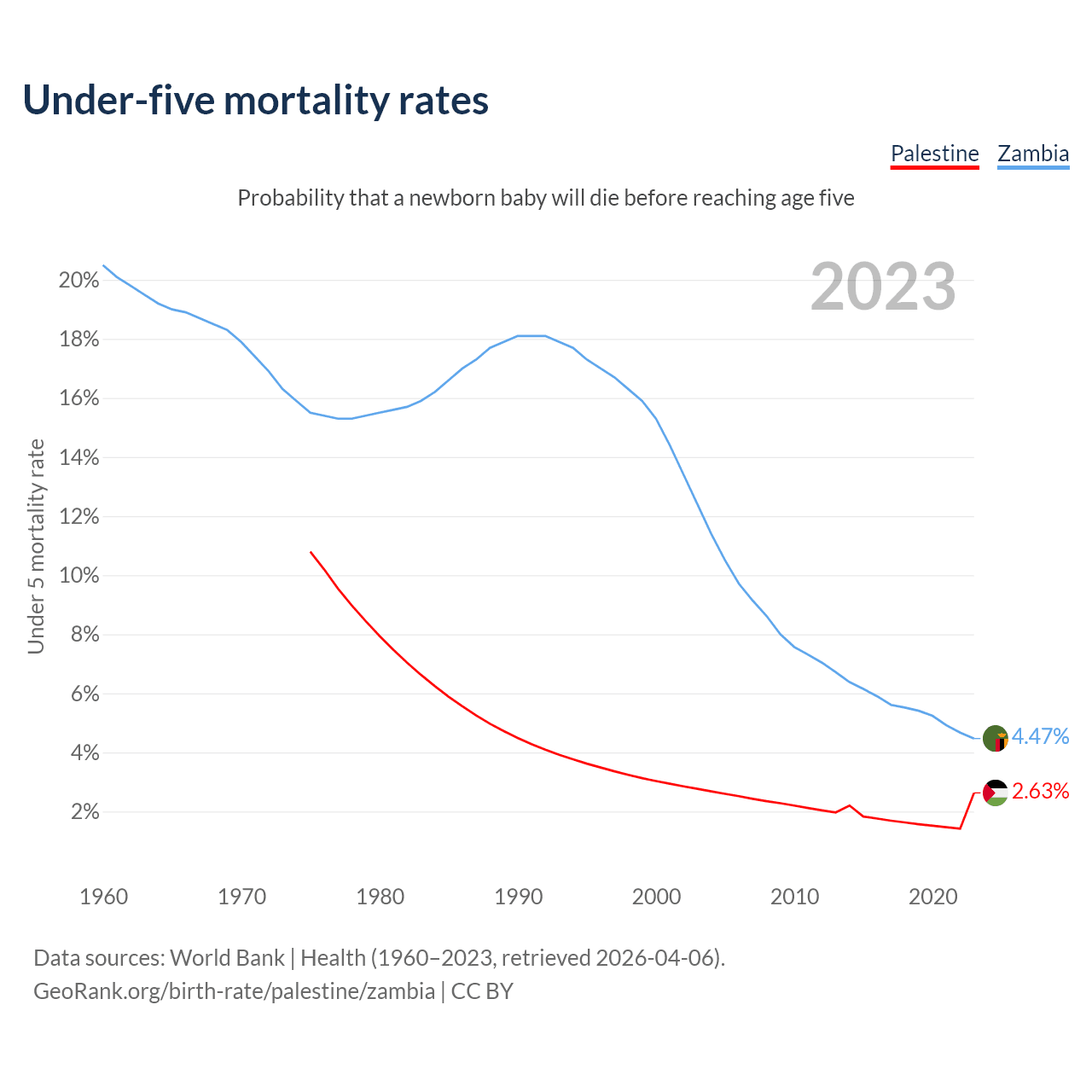 The chance that a newborn baby will die before reaching age five is 2.63% in Palestine and 4.47% in Zambia. Above is a chart with historical data on under-five mortality rates.