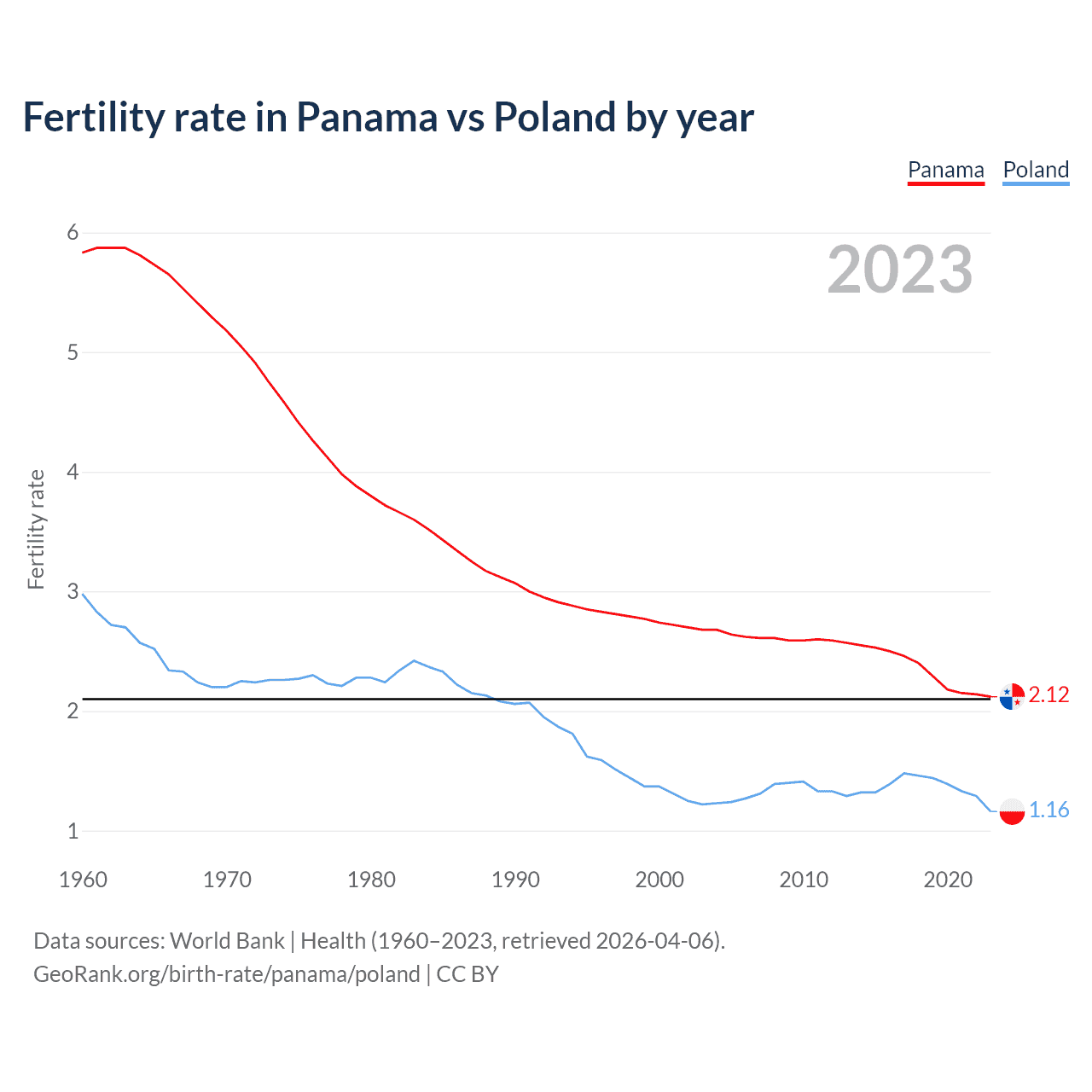 1960 vs 2023, the fertility rate has decreased by 63.6% in Panama and by 61.1% in Poland — in 1960, it was 5.83 and 2.98, respectively.