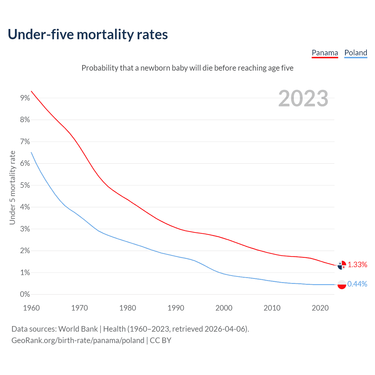 The chance that a newborn baby will die before reaching age five is 1.33% in Panama and 0.44% in Poland. Above is a chart with historical data on under-five mortality rates.