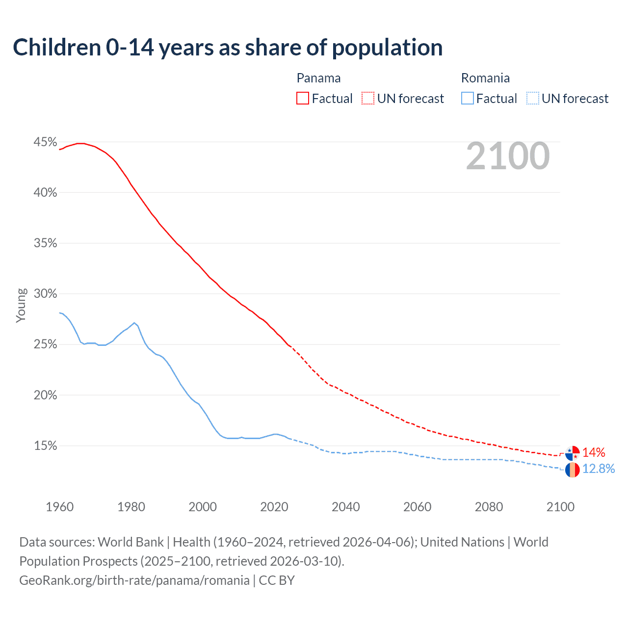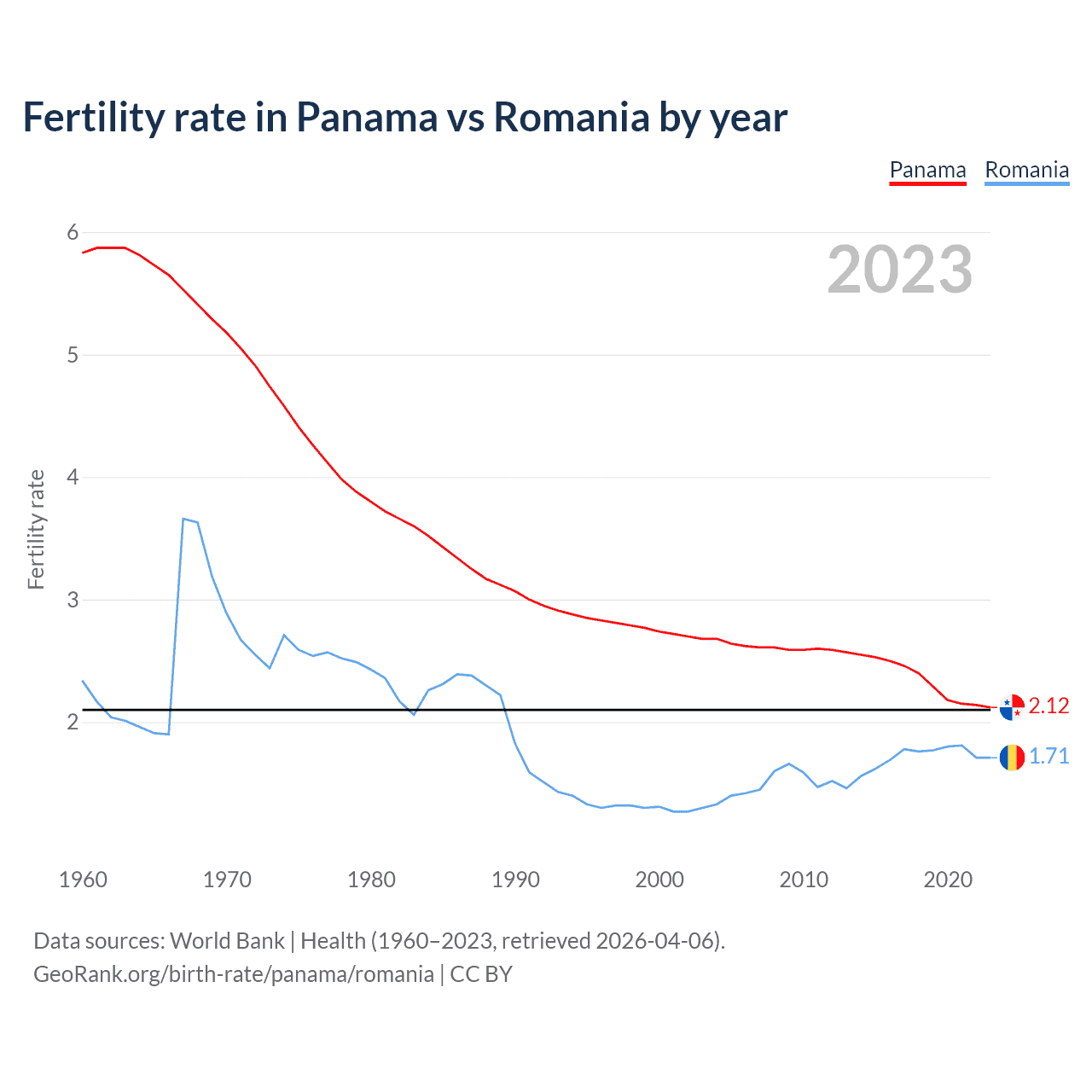 According to the latest available data on birth rates, the fertility rate in Panama was 2.12 children per woman in 2023, compared to 1.71 in Romania in 2023. The replacement level is considered to be 2.1 children per woman.