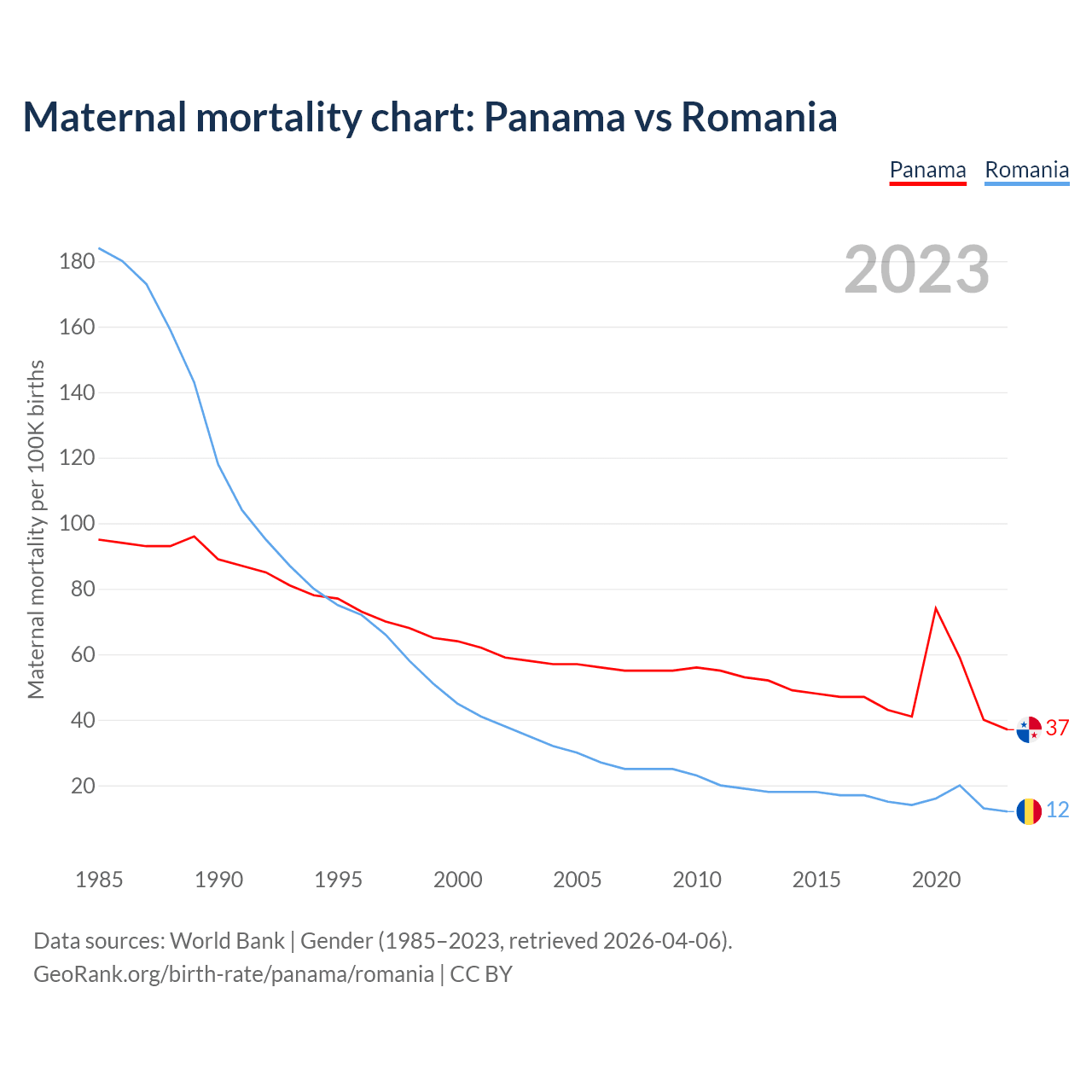The maternal mortality rate, which is the probability of dying during childbirth or within 42 days of pregnancy termination, is 37 deaths per 100,000 live births in Panama, compared to 12 deaths in Romania.