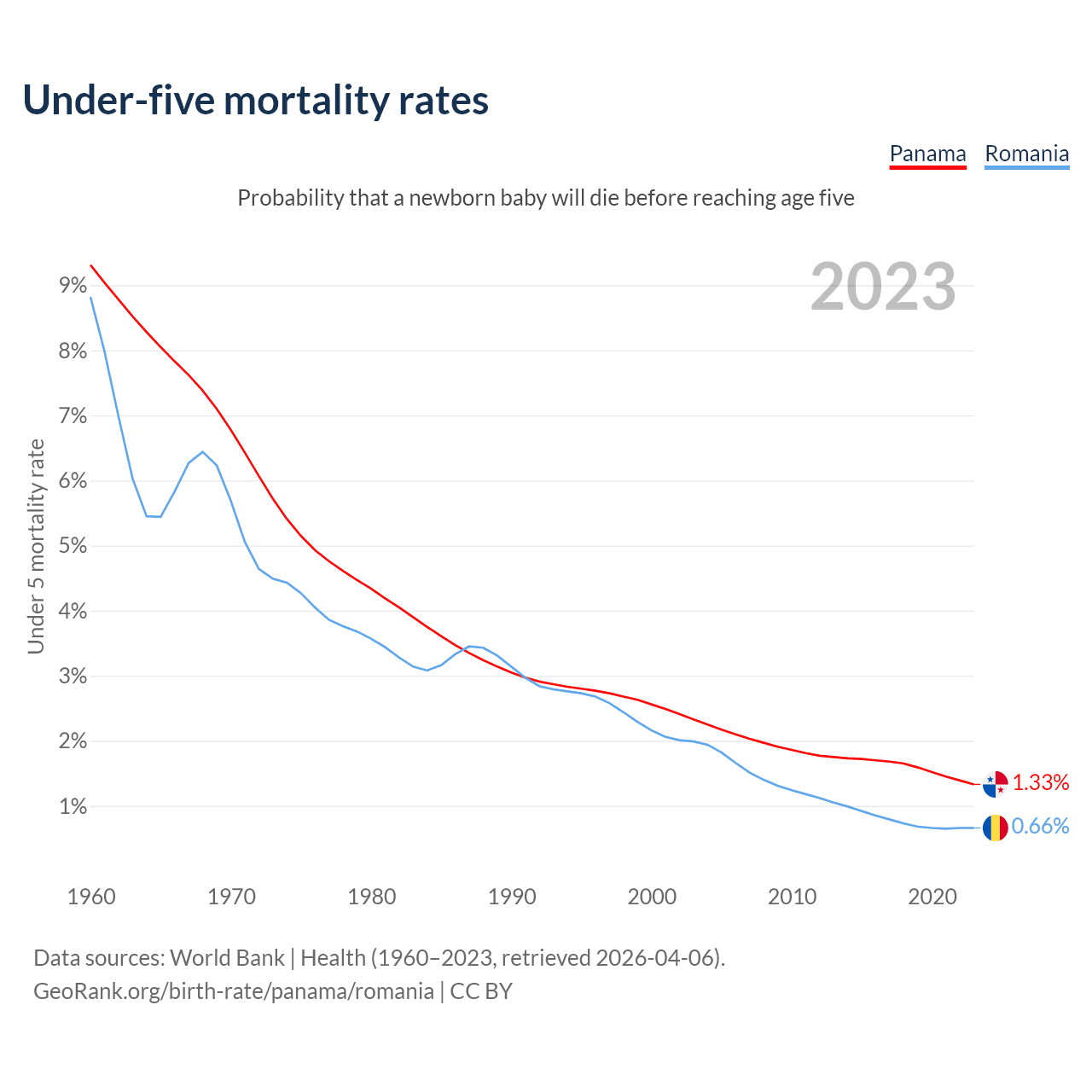 The chance that a newborn baby will die before reaching age five is 1.33% in Panama and 0.66% in Romania. Above is a chart with historical data on under-five mortality rates.