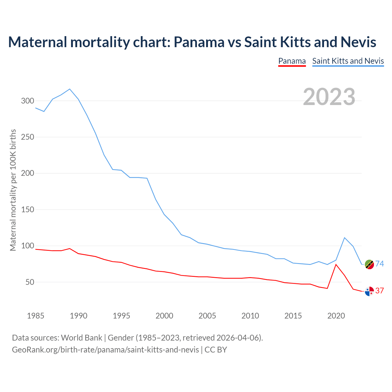 The maternal mortality rate, which is the probability of dying during childbirth or within 42 days of pregnancy termination, is 37 deaths per 100,000 live births in Panama, compared to 74 deaths in Saint Kitts and Nevis.