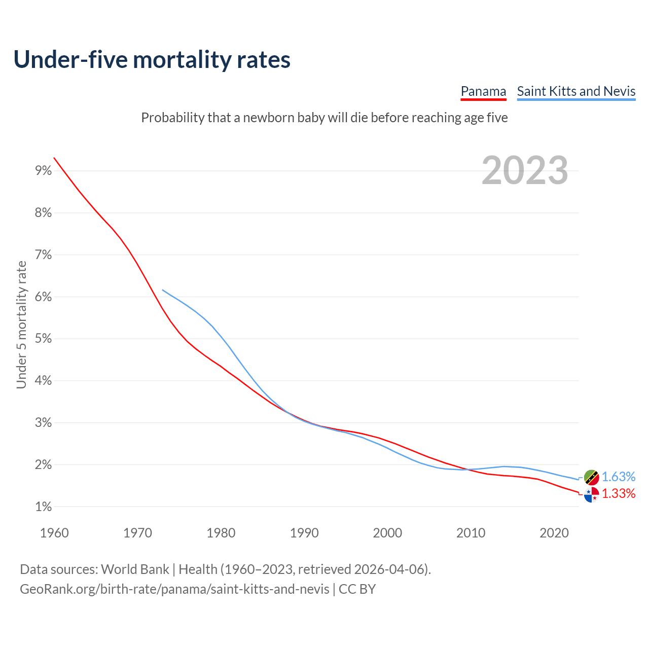 The chance that a newborn baby will die before reaching age five is 1.33% in Panama and 1.63% in Saint Kitts and Nevis. Above is a chart with historical data on under-five mortality rates.