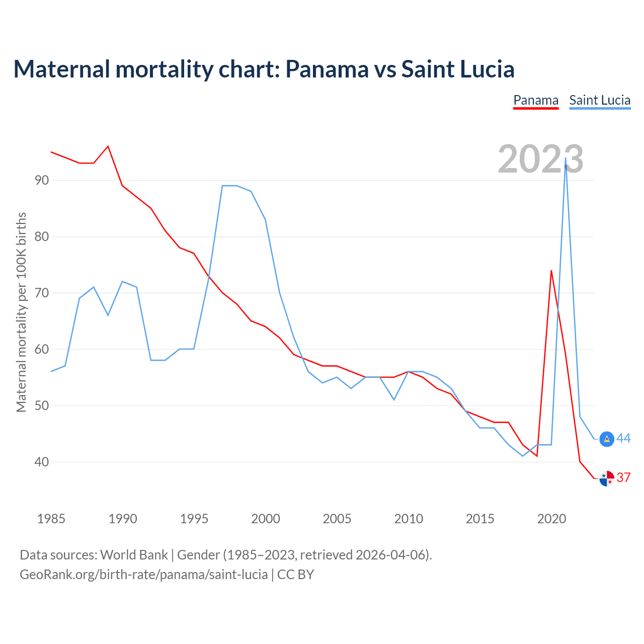 The maternal mortality rate, which is the probability of dying during childbirth or within 42 days of pregnancy termination, is 37 deaths per 100,000 live births in Panama, compared to 44 deaths in Saint Lucia.