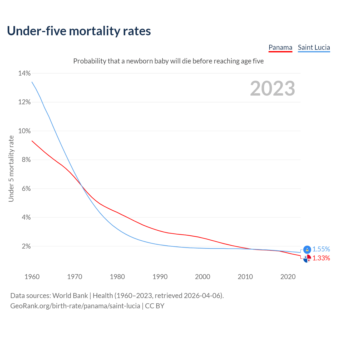 The chance that a newborn baby will die before reaching age five is 1.33% in Panama and 1.55% in Saint Lucia. Above is a chart with historical data on under-five mortality rates.