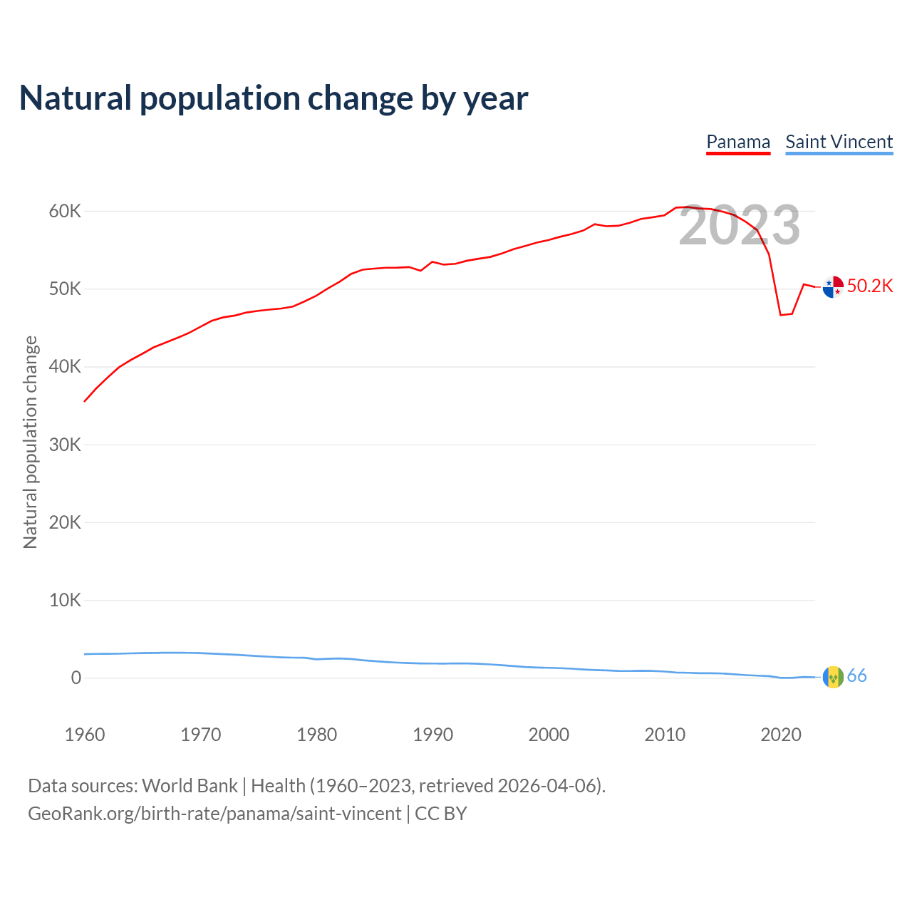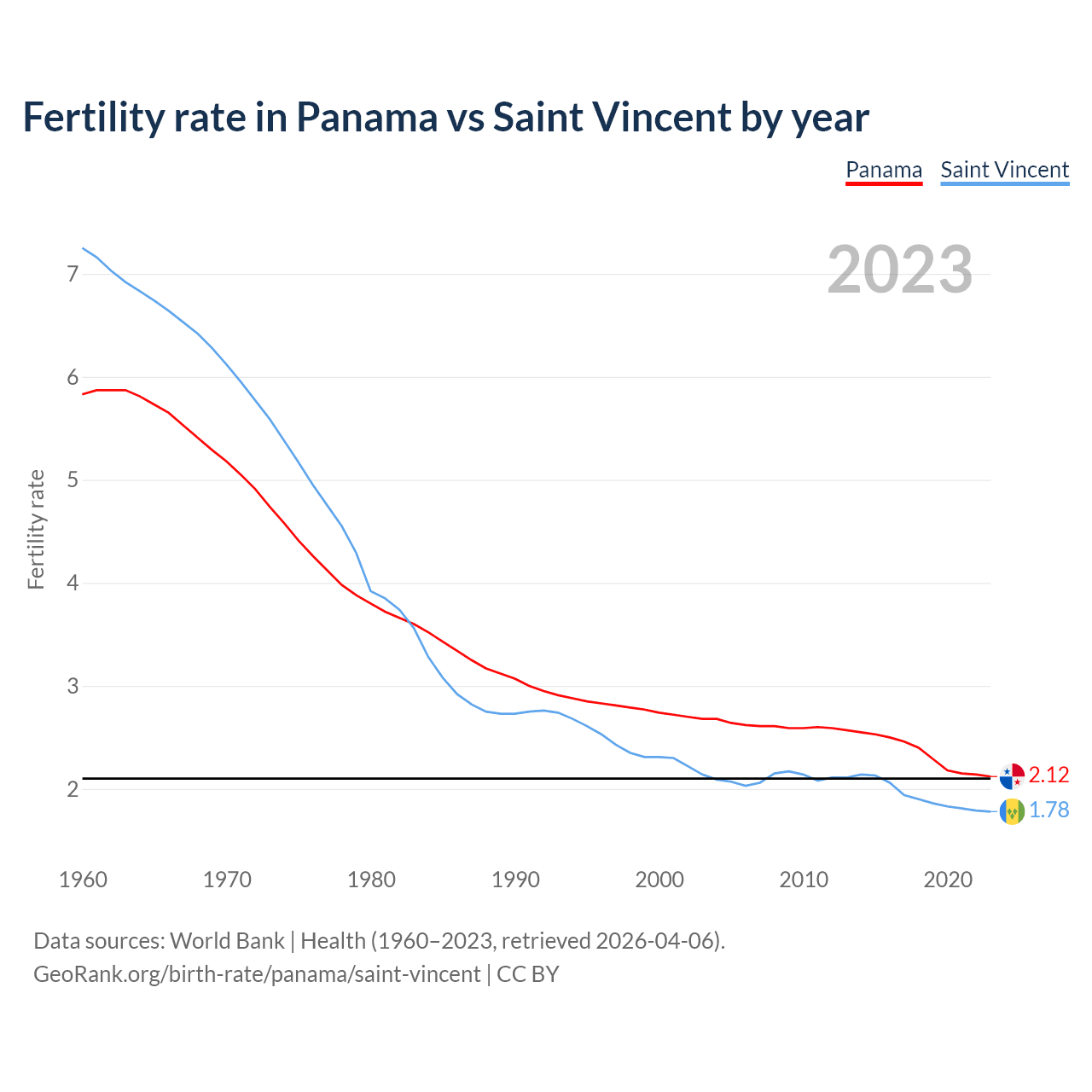 According to the latest available data on birth rates, the fertility rate in Panama was 2.12 children per woman in 2023, compared to 1.78 in Saint Vincent in 2023. The replacement level is considered to be 2.1 children per woman.