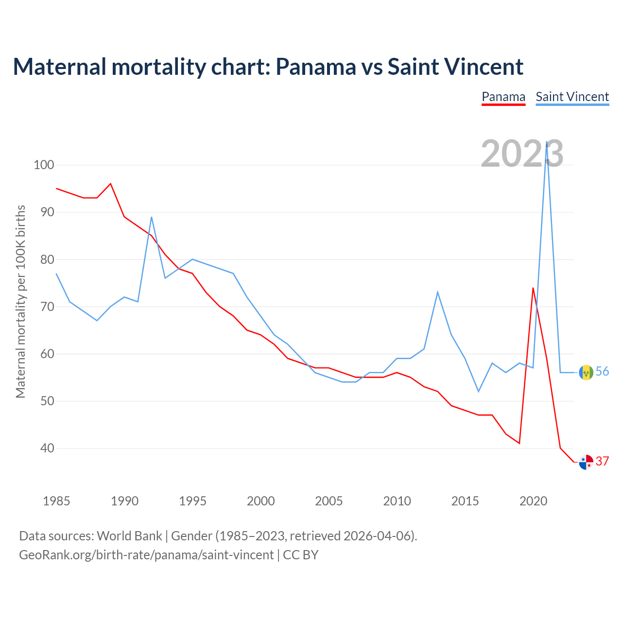 The maternal mortality rate, which is the probability of dying during childbirth or within 42 days of pregnancy termination, is 37 deaths per 100,000 live births in Panama, compared to 56 deaths in Saint Vincent.