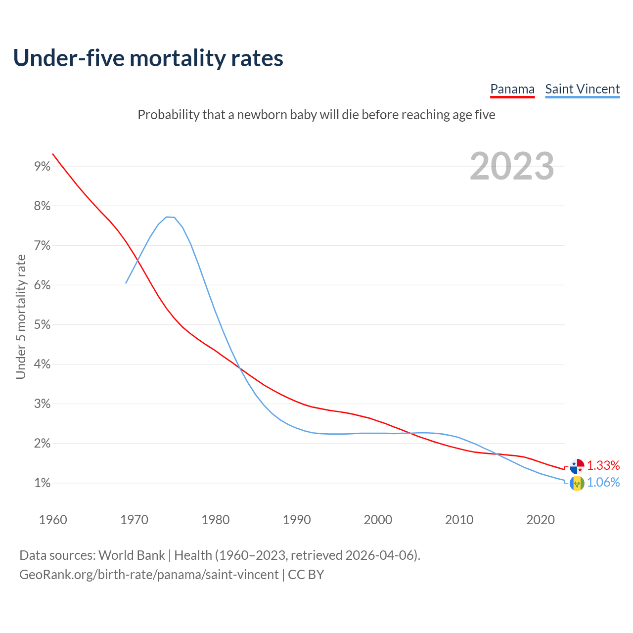 The chance that a newborn baby will die before reaching age five is 1.33% in Panama and 1.06% in Saint Vincent. Above is a chart with historical data on under-five mortality rates.