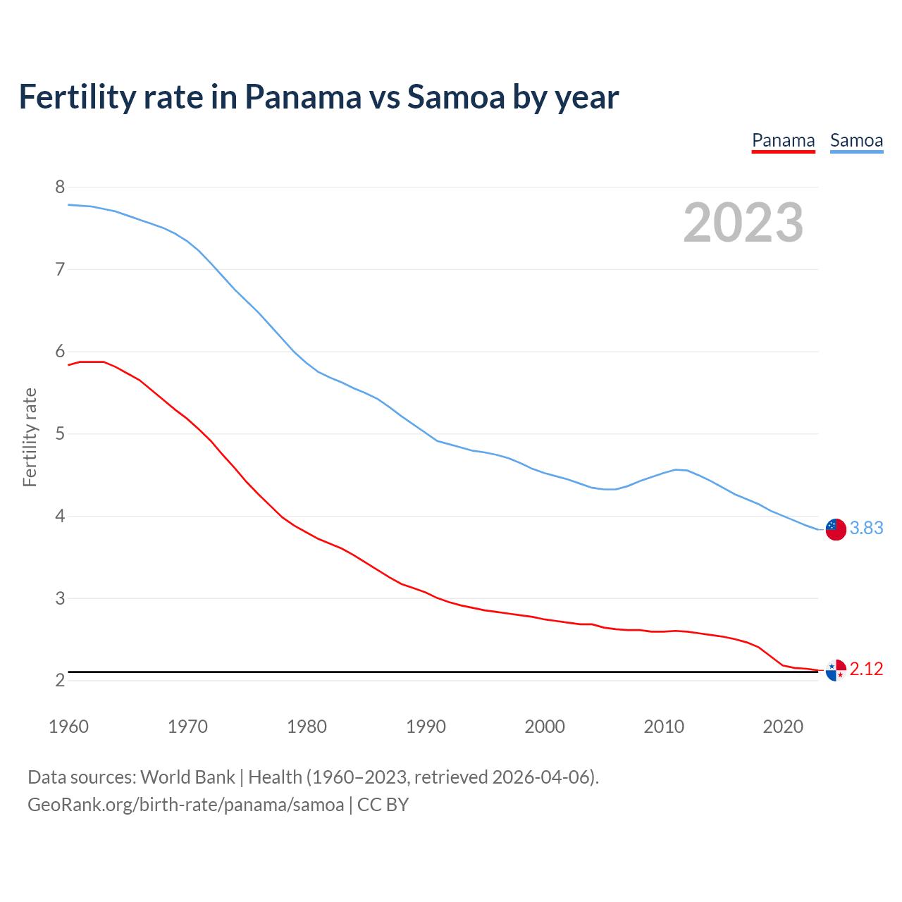 1960 vs 2023, the fertility rate has decreased by 63.6% in Panama and by 50.8% in Samoa — in 1960, it was 5.83 and 7.78, respectively.