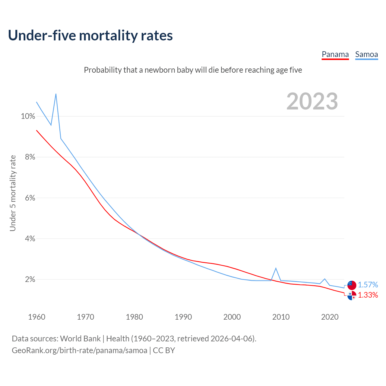 The chance that a newborn baby will die before reaching age five is 1.33% in Panama and 1.57% in Samoa. Above is a chart with historical data on under-five mortality rates.