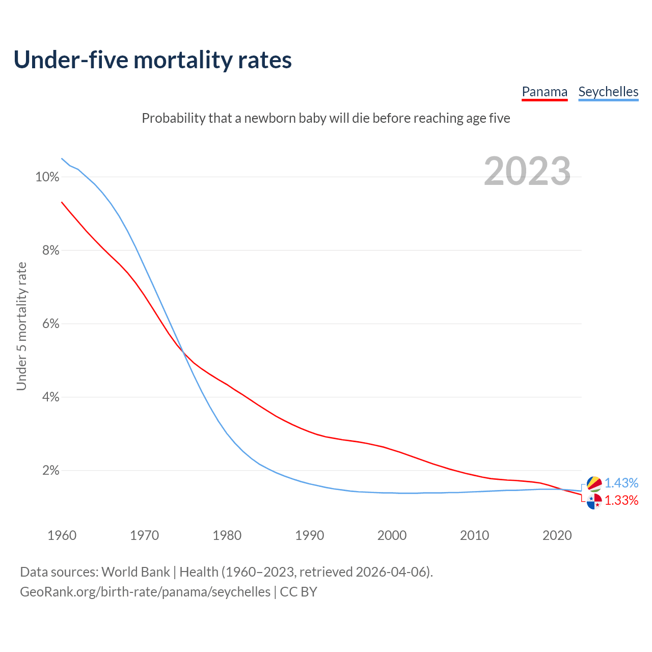 The chance that a newborn baby will die before reaching age five is 1.33% in Panama and 1.43% in the Seychelles. Above is a chart with historical data on under-five mortality rates.