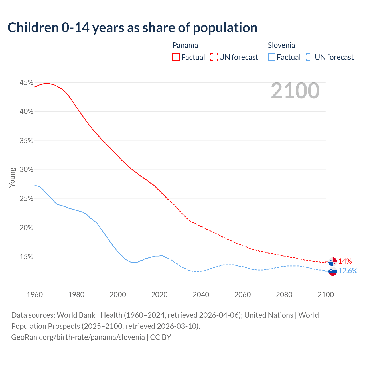 According to the latest available data on birth rates, the fertility rate in Panama was 2.12 children per woman in 2023, compared to 1.51 in Slovenia in 2023. The replacement level is considered to be 2.1 children per woman.
