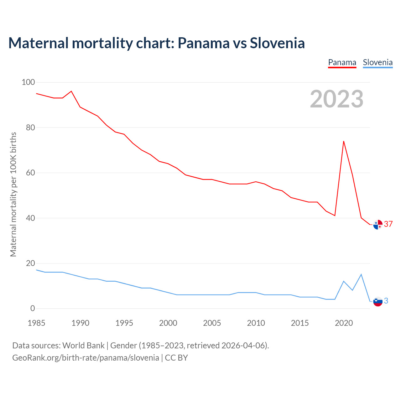The maternal mortality rate, which is the probability of dying during childbirth or within 42 days of pregnancy termination, is 37 deaths per 100,000 live births in Panama, compared to 3 deaths in Slovenia.