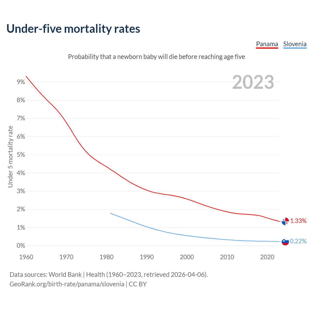 The chance that a newborn baby will die before reaching age five is 1.33% in Panama and 0.22% in Slovenia. Above is a chart with historical data on under-five mortality rates.