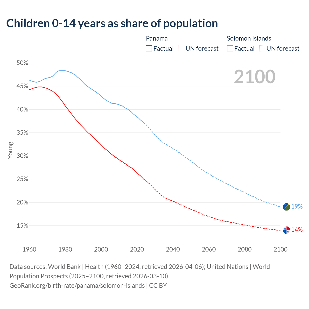 According to the latest available data on birth rates, the fertility rate in Panama was 2.12 children per woman in 2023, compared to 3.56 in the Solomon Islands in 2023. The replacement level is considered to be 2.1 children per woman.