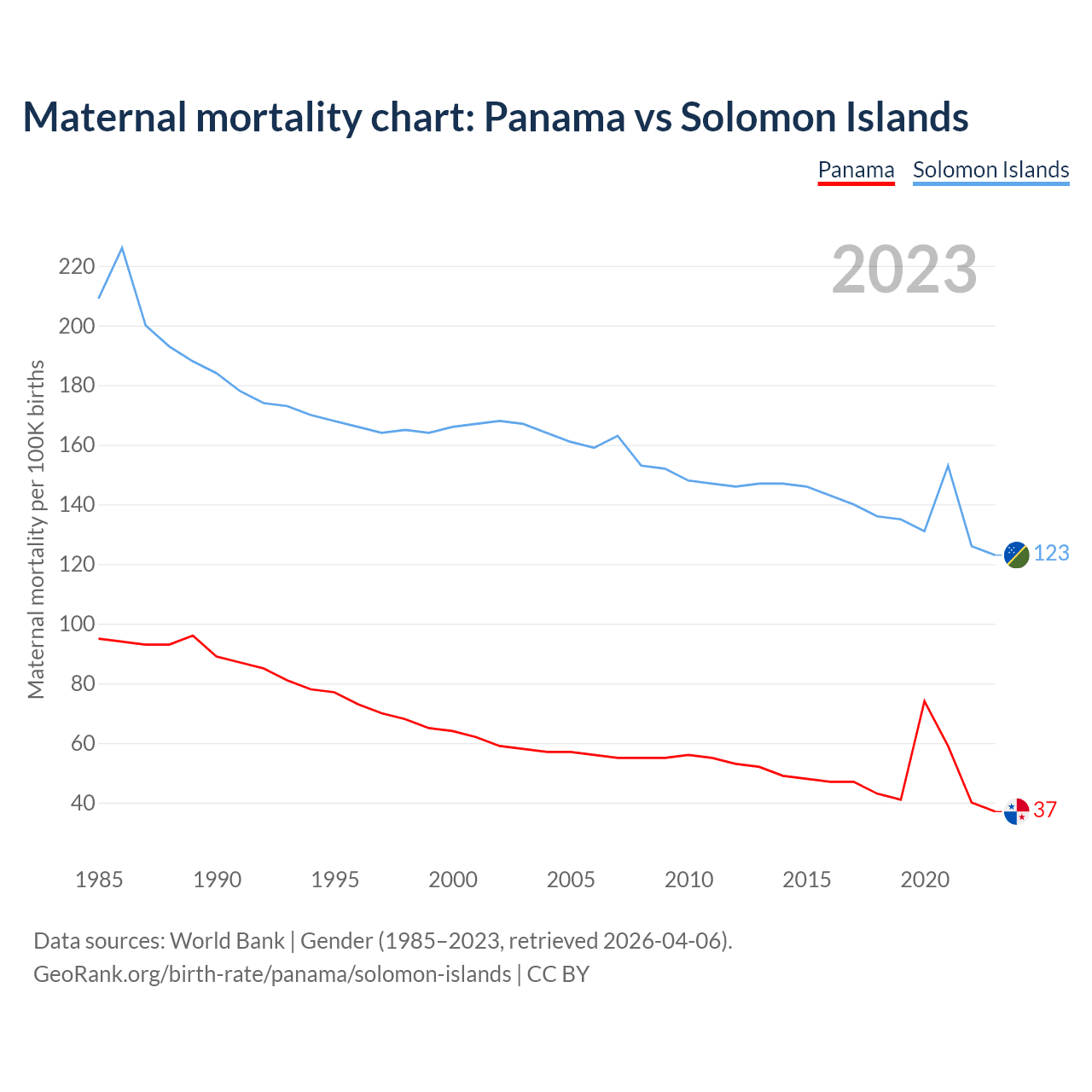 The maternal mortality rate, which is the probability of dying during childbirth or within 42 days of pregnancy termination, is 37 deaths per 100,000 live births in Panama, compared to 123 deaths in the Solomon Islands.