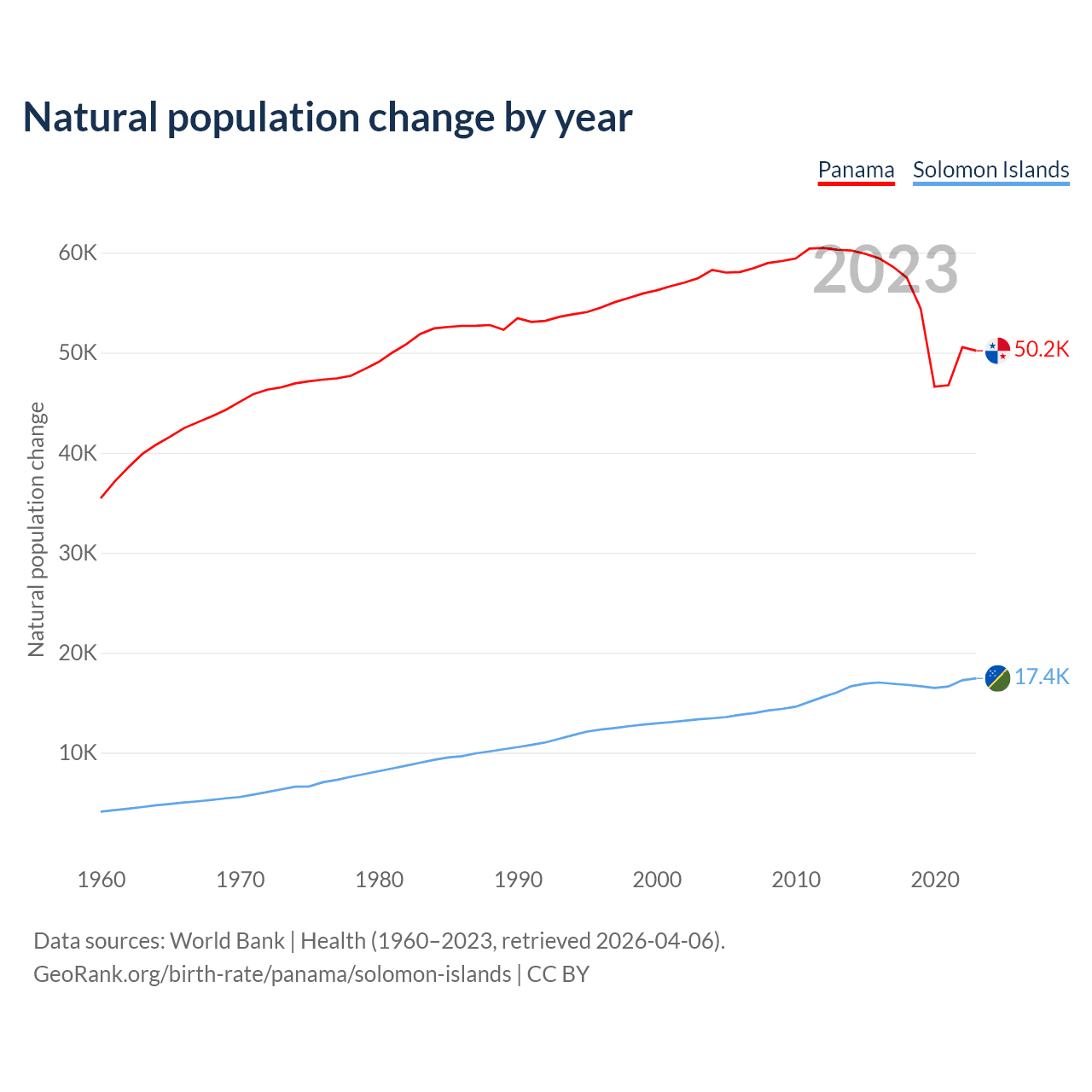 Panama has an annual birth rate of 16 births per 1,000 people, compared to 26.9 for the Solomon Islands. The average number of children a woman is expected to have during her lifetime — the fertility rate, is 2.12 in Panama and 3.56 in the Solomon Islands — 67.9% difference.