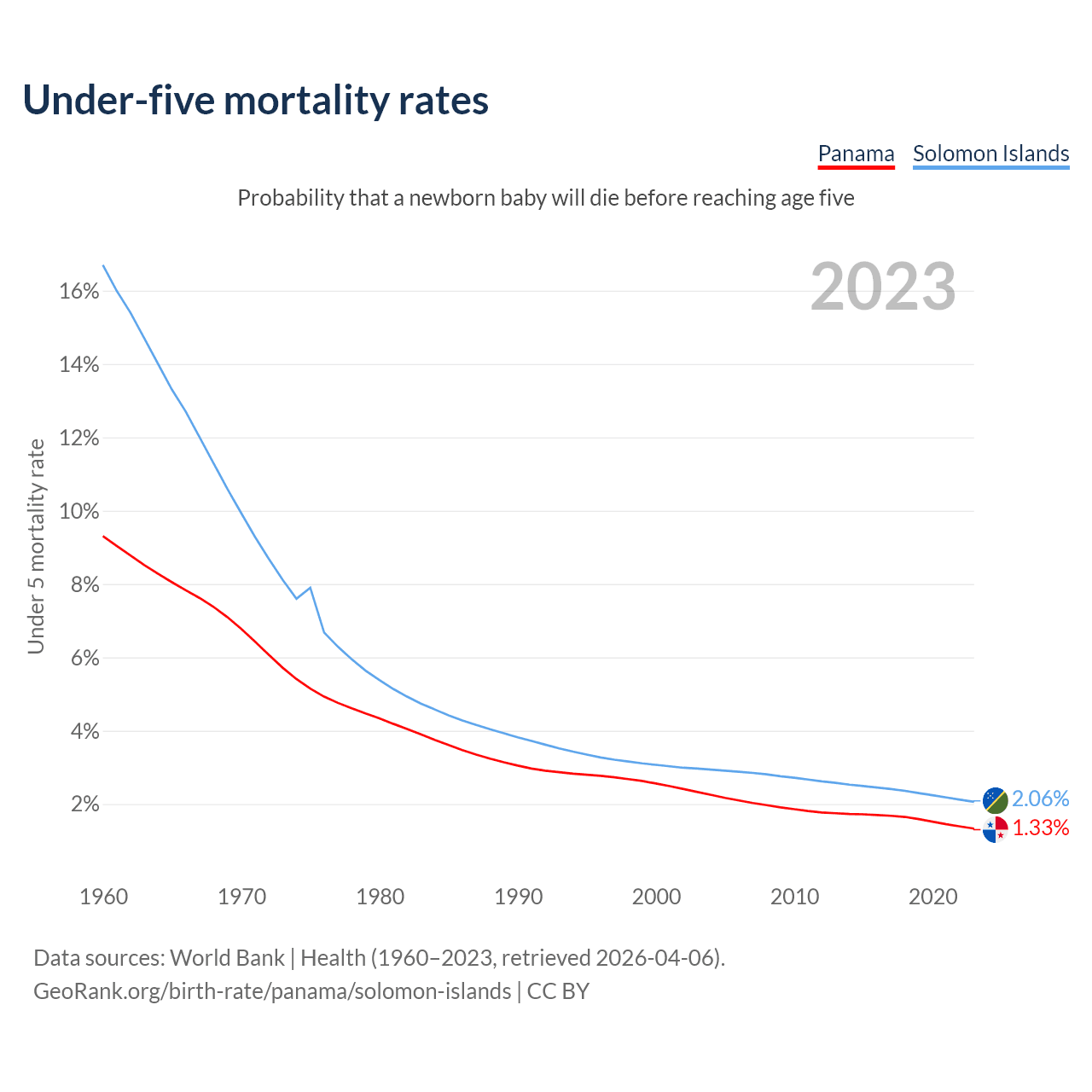 The chance that a newborn baby will die before reaching age five is 1.33% in Panama and 2.06% in the Solomon Islands. Above is a chart with historical data on under-five mortality rates.