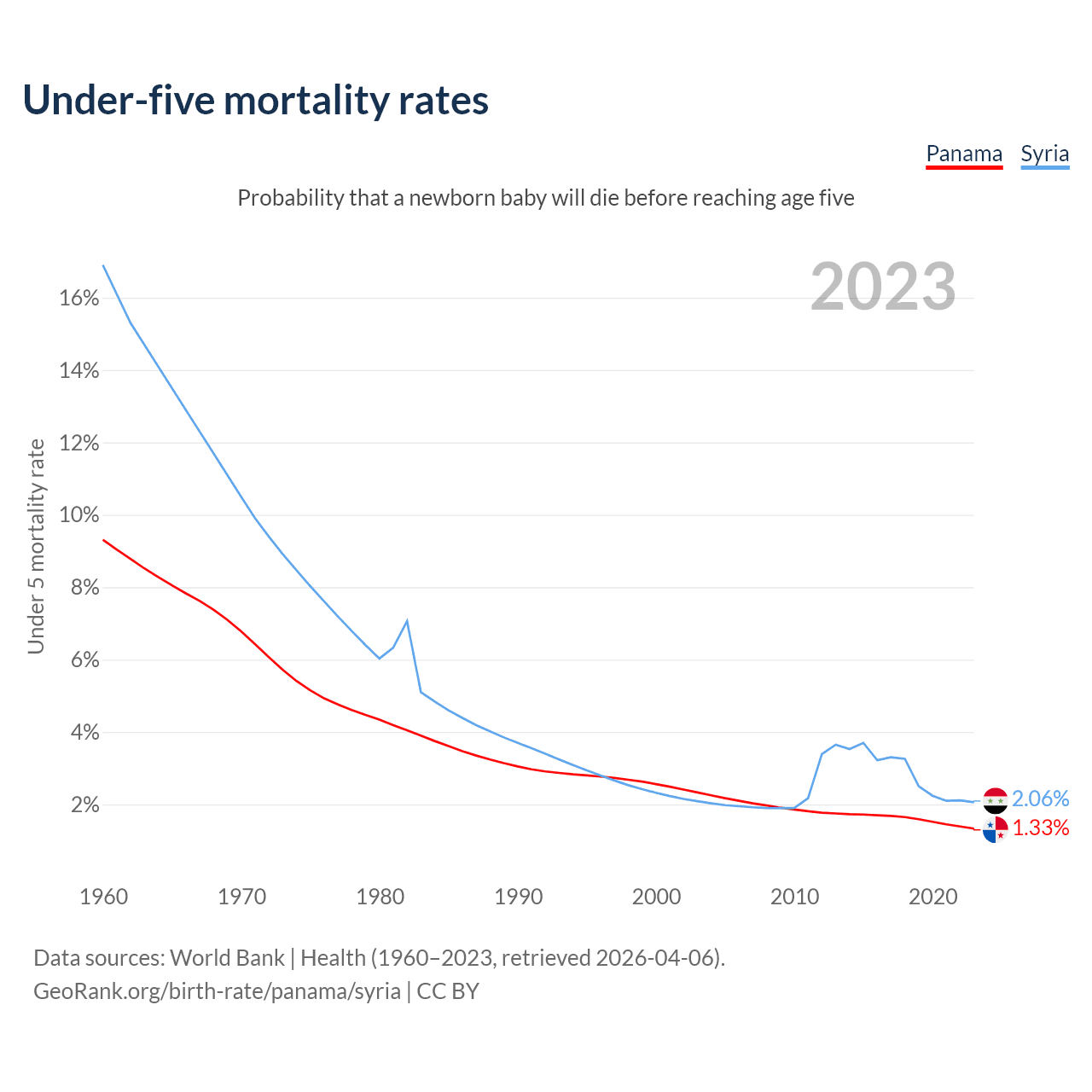 The chance that a newborn baby will die before reaching age five is 1.33% in Panama and 2.06% in Syria. Above is a chart with historical data on under-five mortality rates.