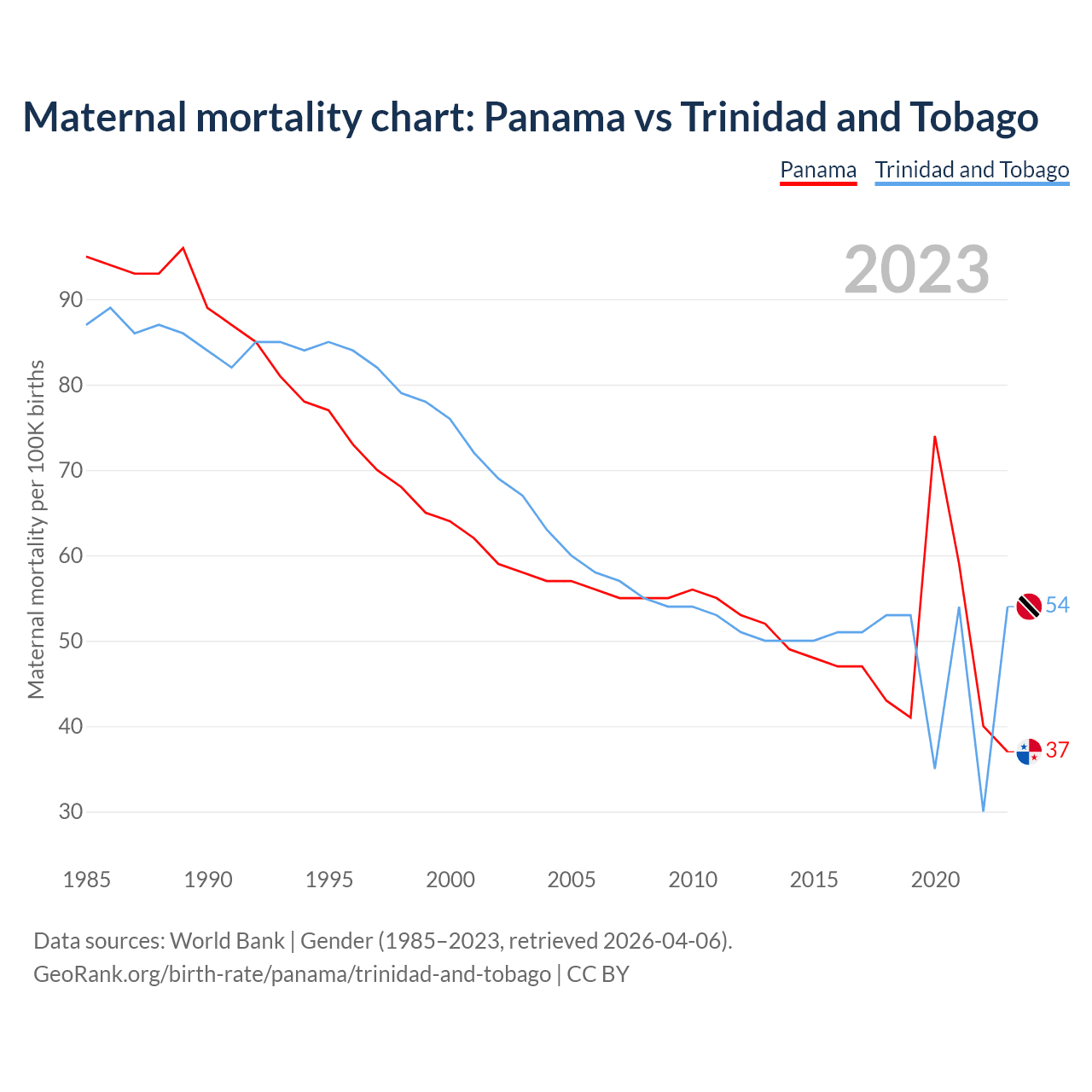 The maternal mortality rate, which is the probability of dying during childbirth or within 42 days of pregnancy termination, is 37 deaths per 100,000 live births in Panama, compared to 54 deaths in Trinidad and Tobago.