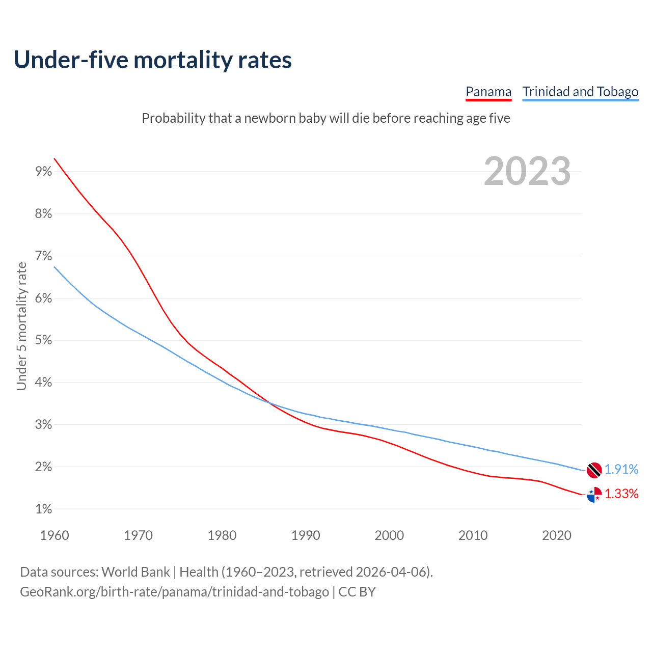 The chance that a newborn baby will die before reaching age five is 1.33% in Panama and 1.91% in Trinidad and Tobago. Above is a chart with historical data on under-five mortality rates.