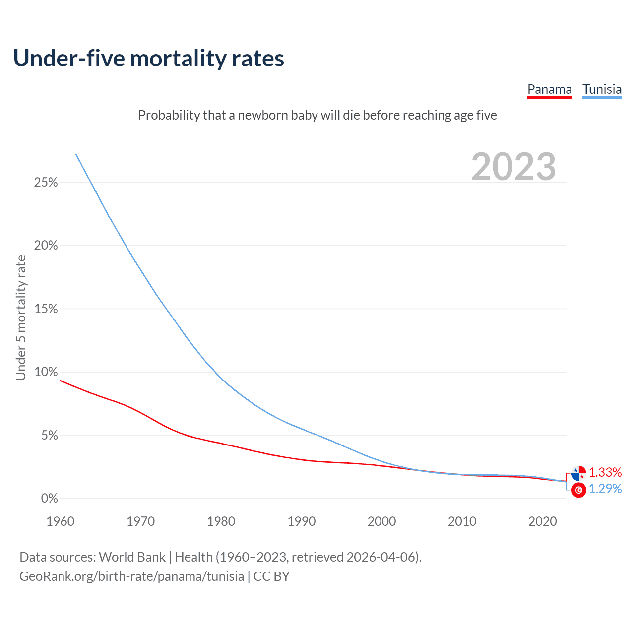 The chance that a newborn baby will die before reaching age five is 1.33% in Panama and 1.29% in Tunisia. Above is a chart with historical data on under-five mortality rates.