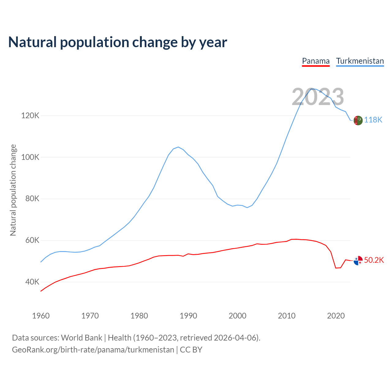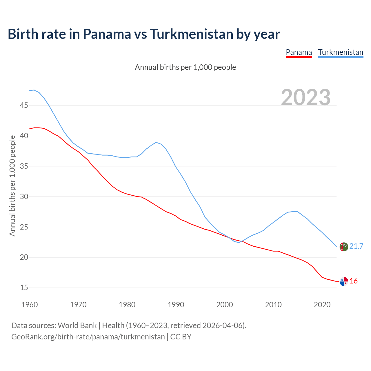 Panama has an annual birth rate of 16 births per 1,000 people, compared to 21.7 for Turkmenistan. The average number of children a woman is expected to have during her lifetime — the fertility rate, is 2.12 in Panama and 2.69 in Turkmenistan — 26.9% difference.