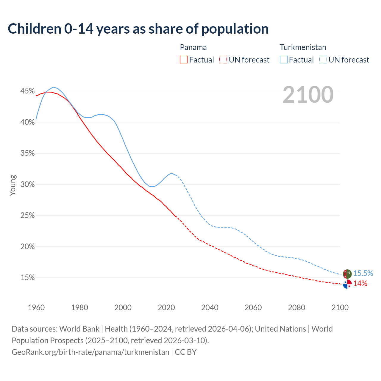 According to the latest available data on birth rates, the fertility rate in Panama was 2.12 children per woman in 2023, compared to 2.69 in Turkmenistan in 2023. The replacement level is considered to be 2.1 children per woman.