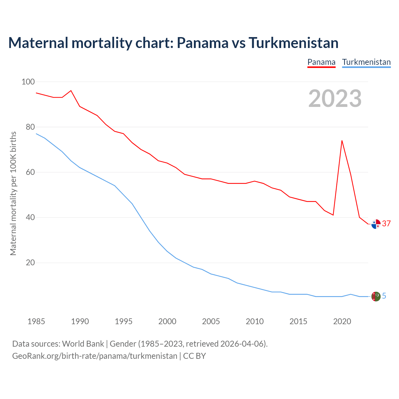 The maternal mortality rate, which is the probability of dying during childbirth or within 42 days of pregnancy termination, is 37 deaths per 100,000 live births in Panama, compared to 5 deaths in Turkmenistan.