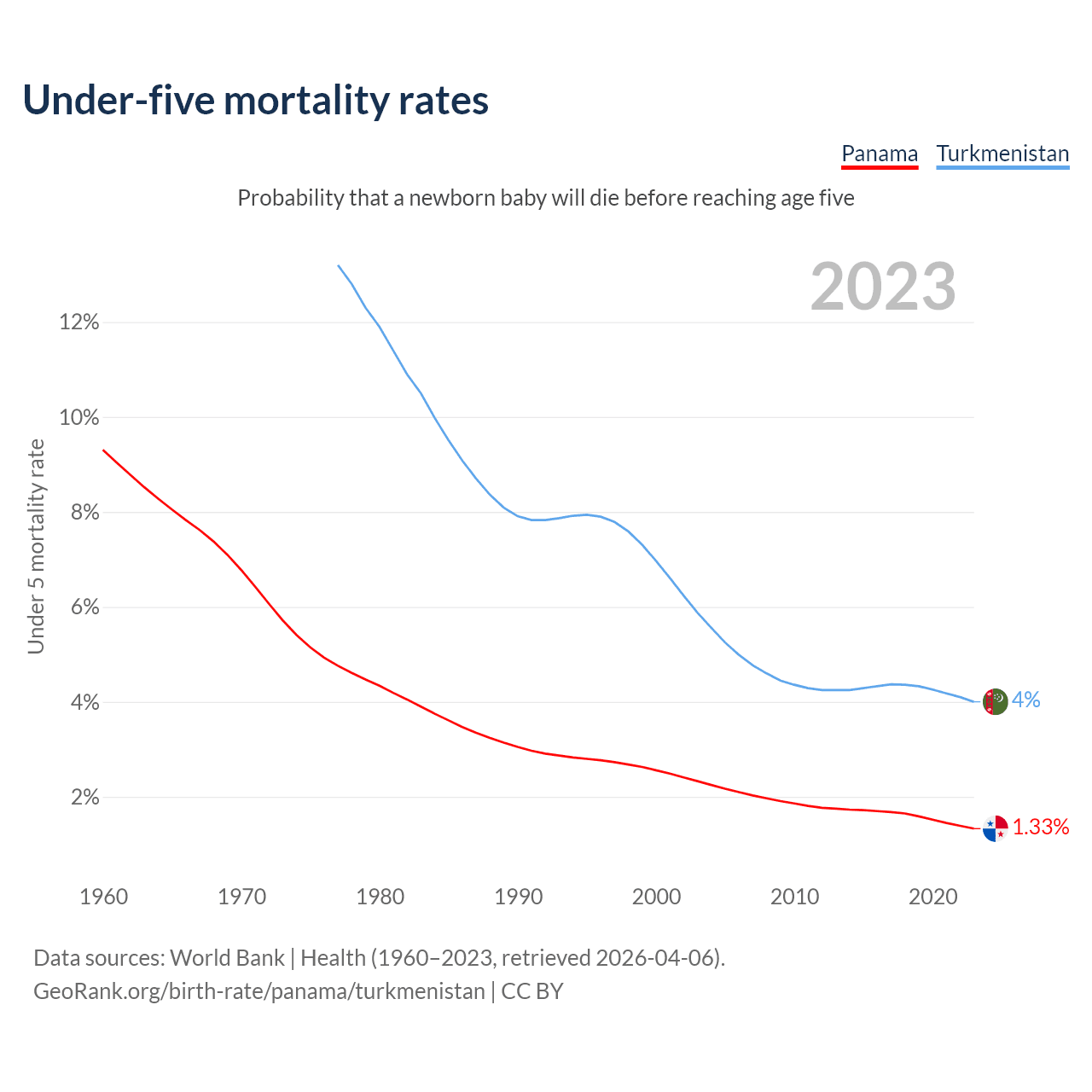 The chance that a newborn baby will die before reaching age five is 1.33% in Panama and 4% in Turkmenistan. Above is a chart with historical data on under-five mortality rates.