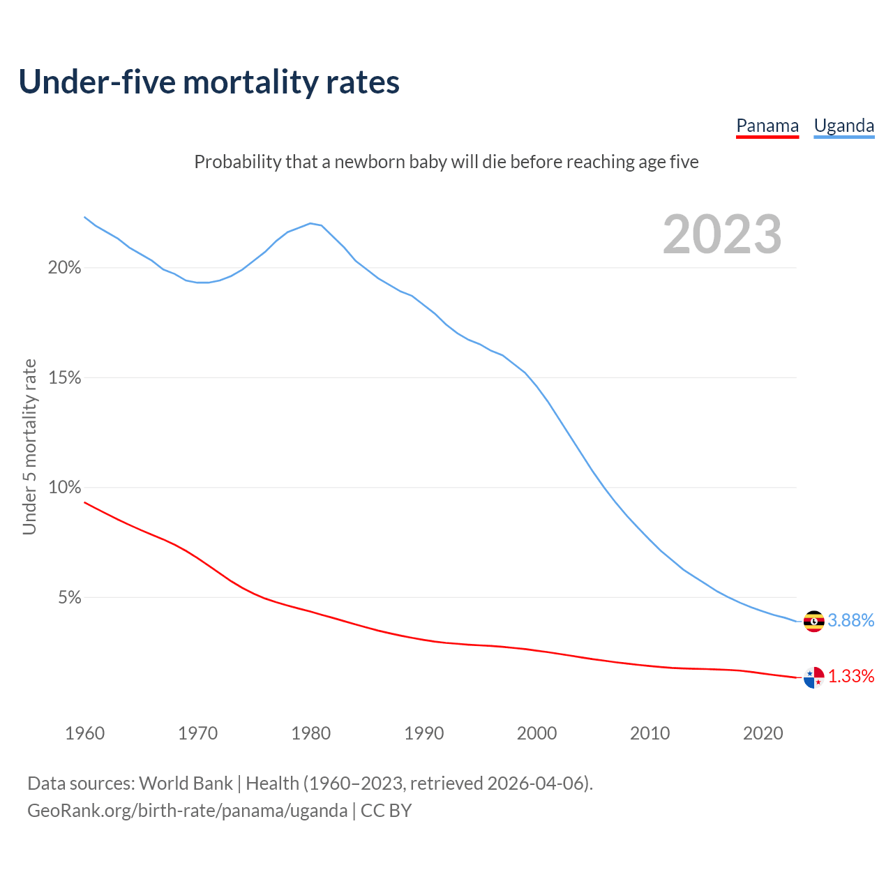 The chance that a newborn baby will die before reaching age five is 1.33% in Panama and 3.88% in Uganda. Above is a chart with historical data on under-five mortality rates.