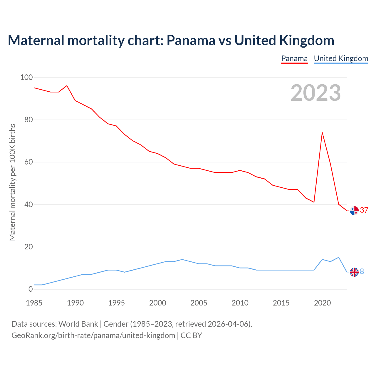 The maternal mortality rate, which is the probability of dying during childbirth or within 42 days of pregnancy termination, is 37 deaths per 100,000 live births in Panama, compared to 8 deaths in the United Kingdom.