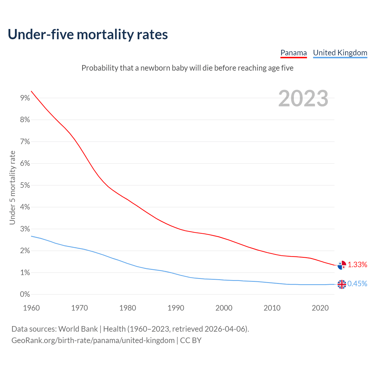 The chance that a newborn baby will die before reaching age five is 1.33% in Panama and 0.45% in the United Kingdom. Above is a chart with historical data on under-five mortality rates.