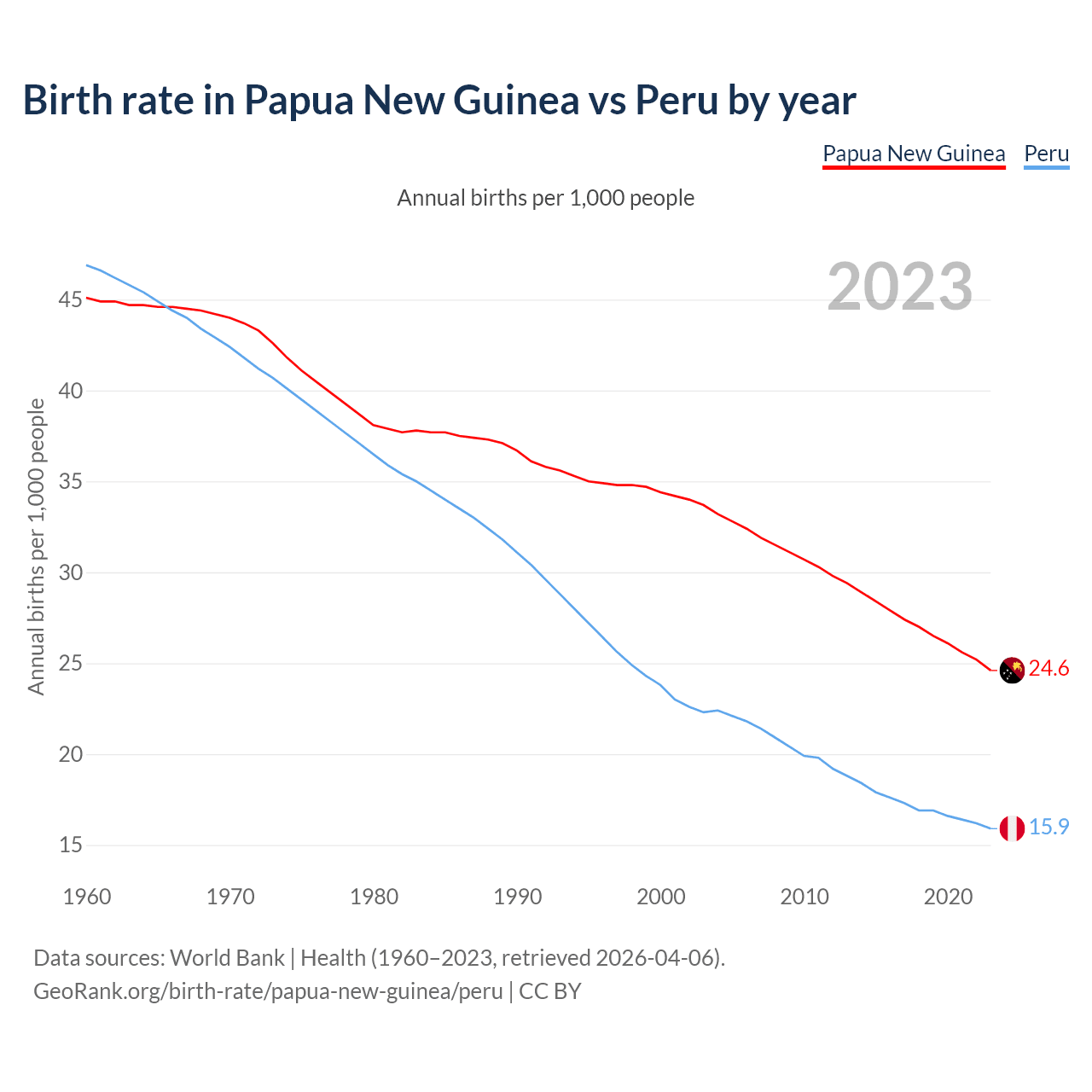Papua New Guinea has an annual birth rate of 24.6 births per 1,000 people, compared to 15.9 for Peru. The average number of children a woman is expected to have during her lifetime — the fertility rate, is 3.1 in Papua New Guinea and 1.98 in Peru — 36.1% difference.