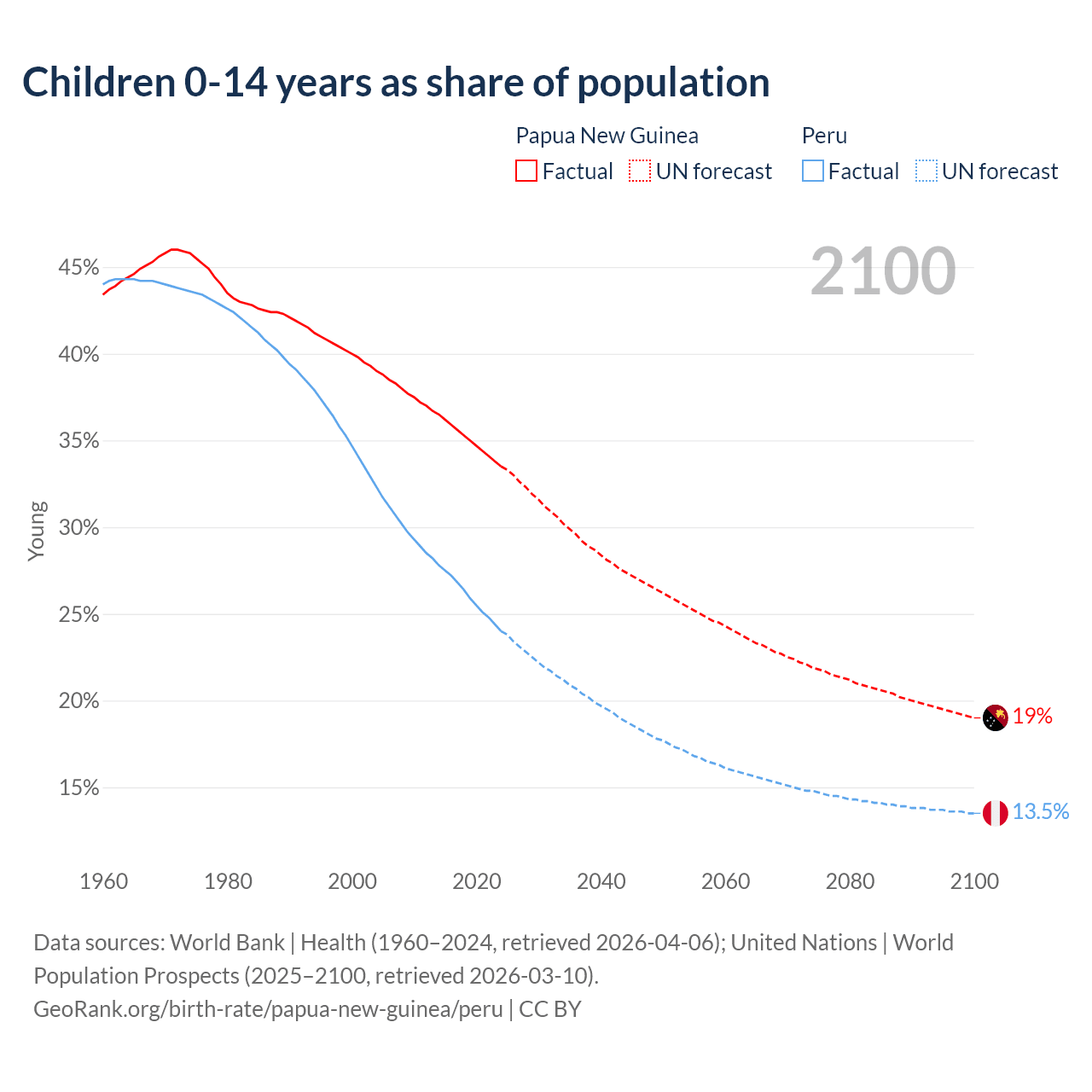 According to the latest available data on birth rates, the fertility rate in Papua New Guinea was 3.1 children per woman in 2023, compared to 1.98 in Peru in 2023. The replacement level is considered to be 2.1 children per woman.