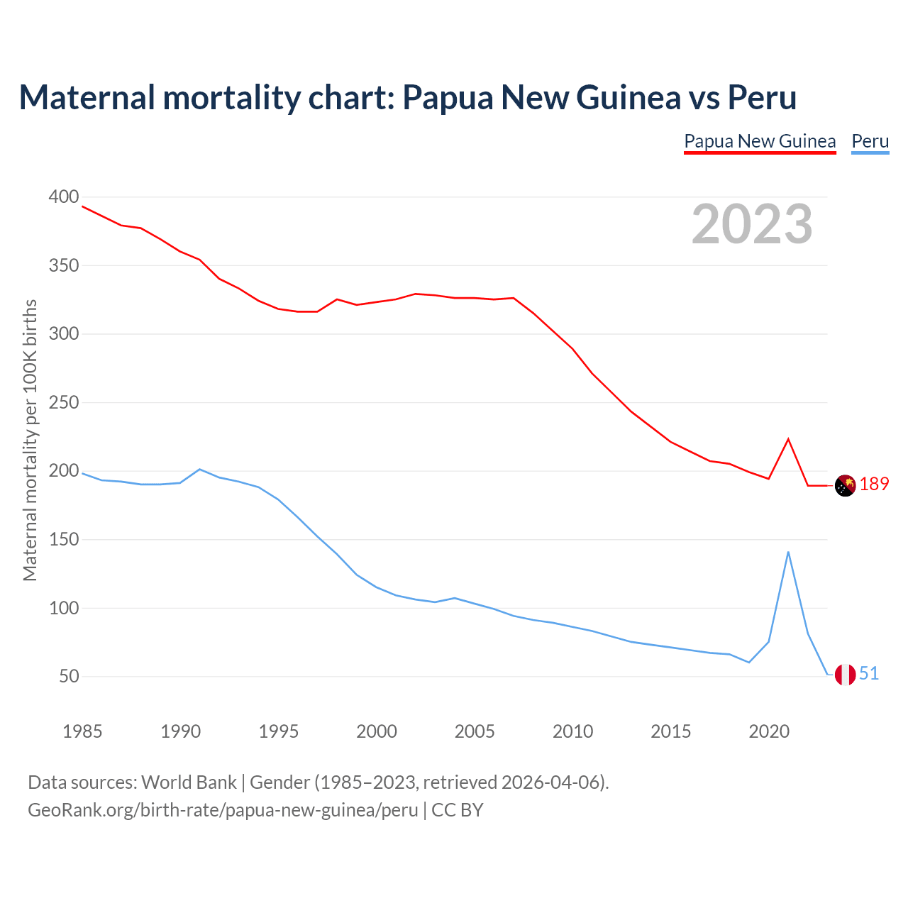 The maternal mortality rate, which is the probability of dying during childbirth or within 42 days of pregnancy termination, is 189 deaths per 100,000 live births in Papua New Guinea, compared to 51 deaths in Peru.
