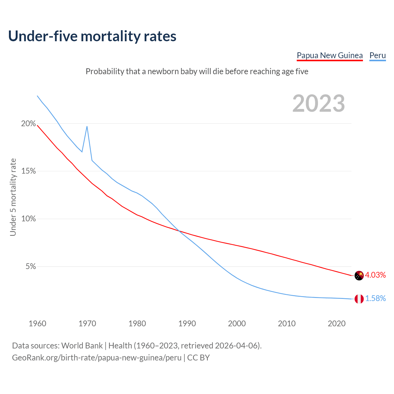 The chance that a newborn baby will die before reaching age five is 4.03% in Papua New Guinea and 1.58% in Peru. Above is a chart with historical data on under-five mortality rates.