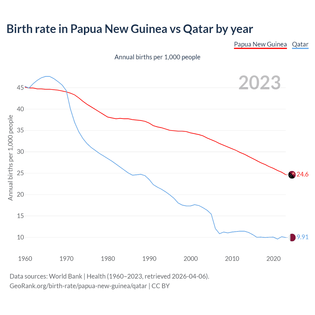 Papua New Guinea has an annual birth rate of 24.6 births per 1,000 people, compared to 9.91 for Qatar. The average number of children a woman is expected to have during her lifetime — the fertility rate, is 3.1 in Papua New Guinea and 1.73 in Qatar — 44.2% difference.