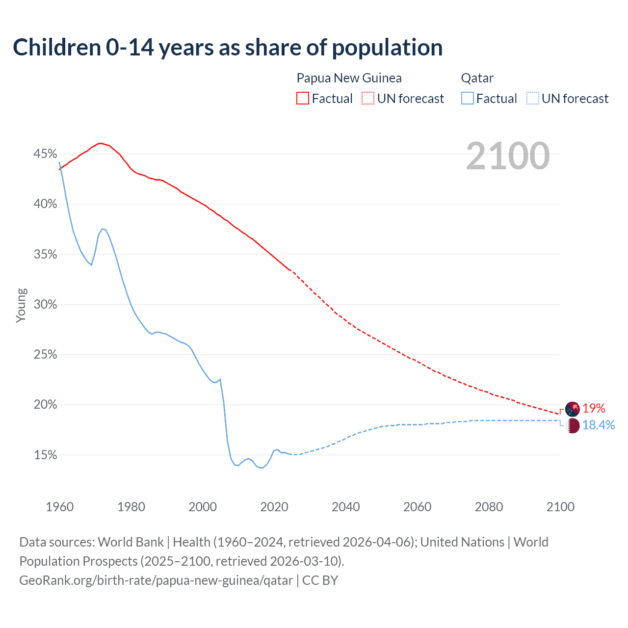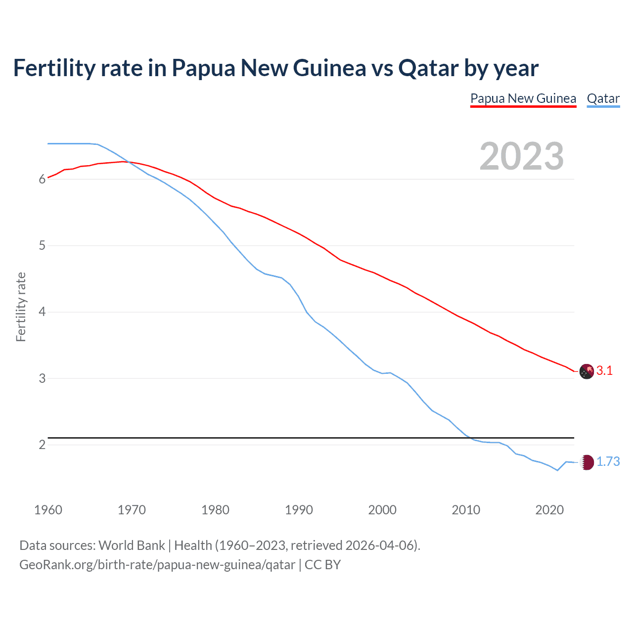 According to the latest available data on birth rates, the fertility rate in Papua New Guinea was 3.1 children per woman in 2023, compared to 1.73 in Qatar in 2023. The replacement level is considered to be 2.1 children per woman.