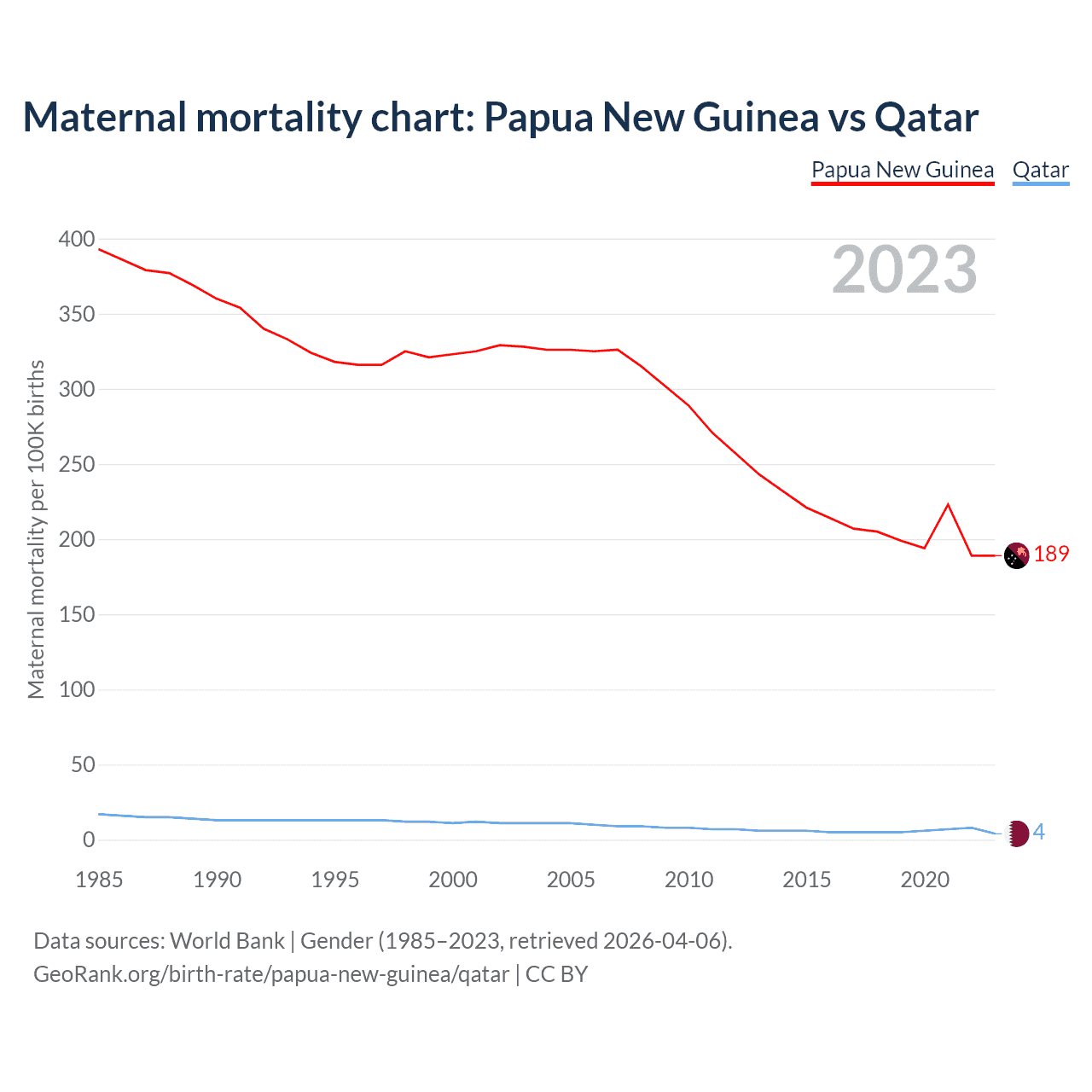 The maternal mortality rate, which is the probability of dying during childbirth or within 42 days of pregnancy termination, is 189 deaths per 100,000 live births in Papua New Guinea, compared to 4 deaths in Qatar.