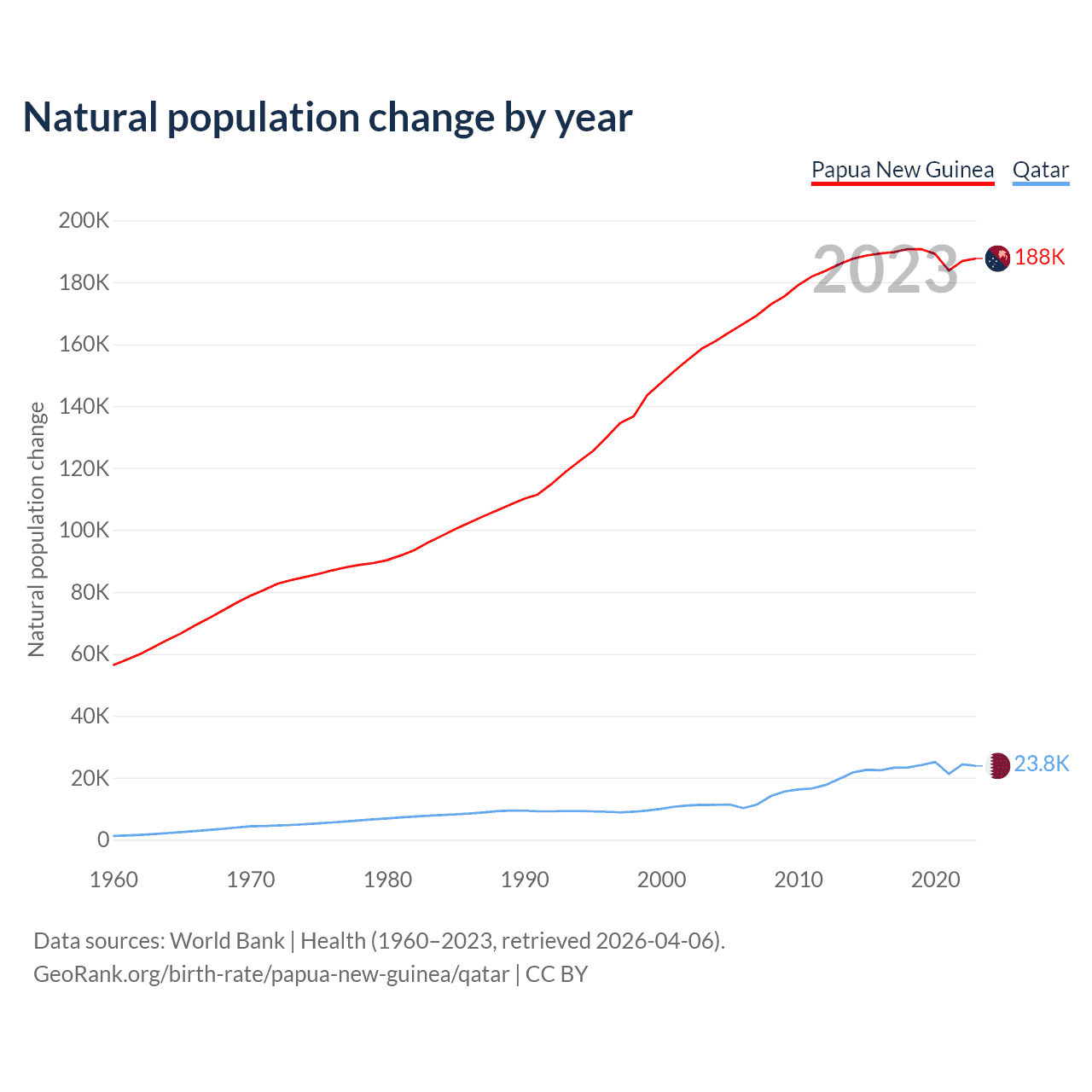 - Papua New Guinea is ranked 55/196 by birth rate compared to 147/196 for Qatar.