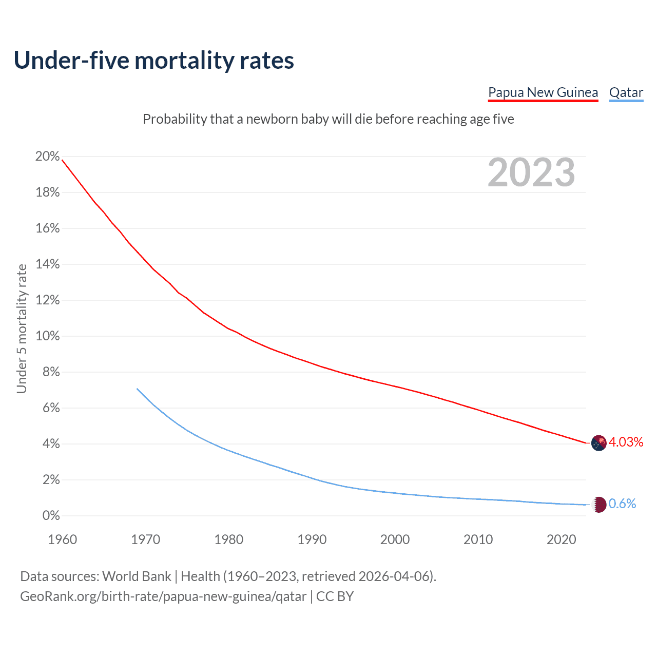 The chance that a newborn baby will die before reaching age five is 4.03% in Papua New Guinea and 0.6% in Qatar. Above is a chart with historical data on under-five mortality rates.