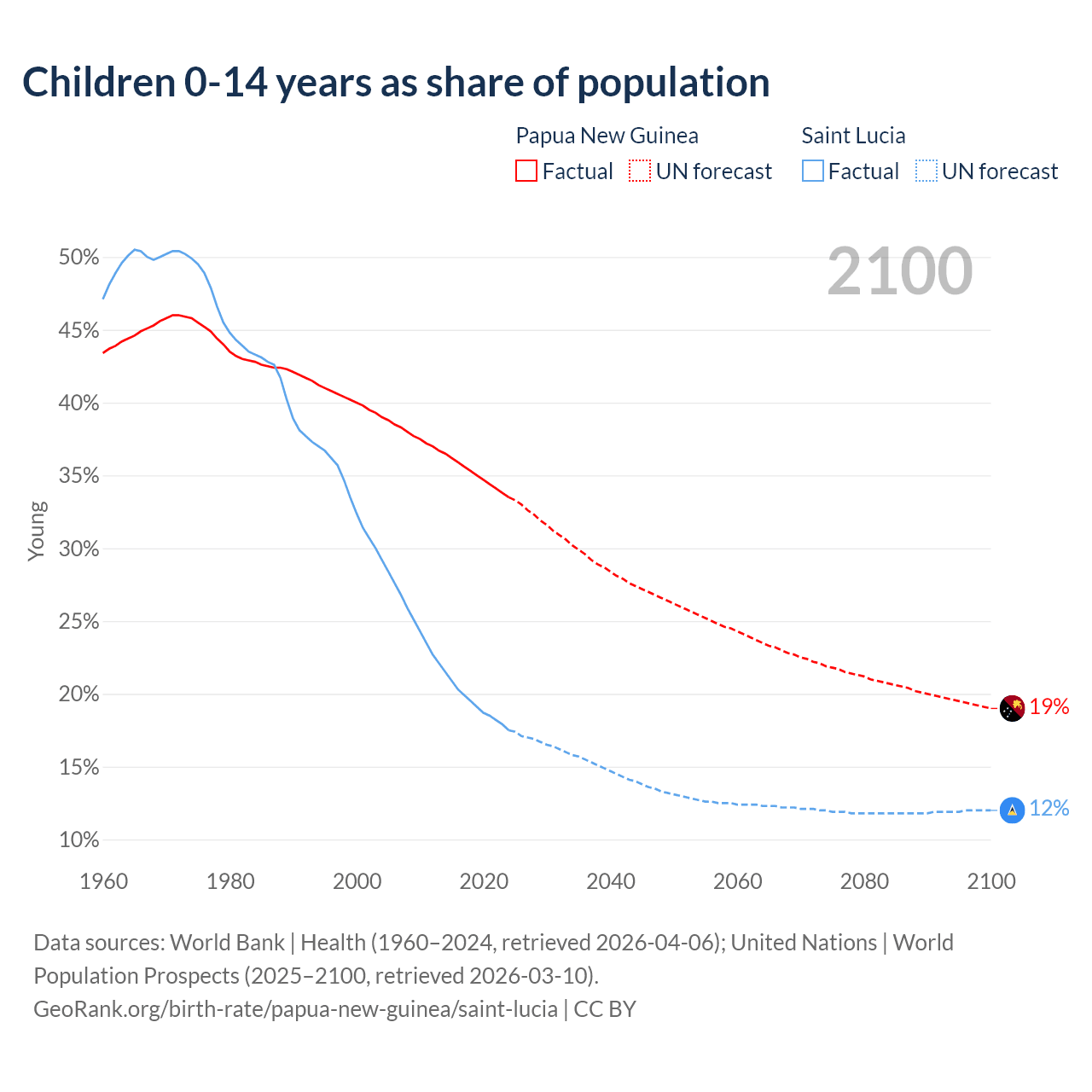 According to the latest available data on birth rates, the fertility rate in Papua New Guinea was 3.1 children per woman in 2023, compared to 1.38 in Saint Lucia in 2023. The replacement level is considered to be 2.1 children per woman.