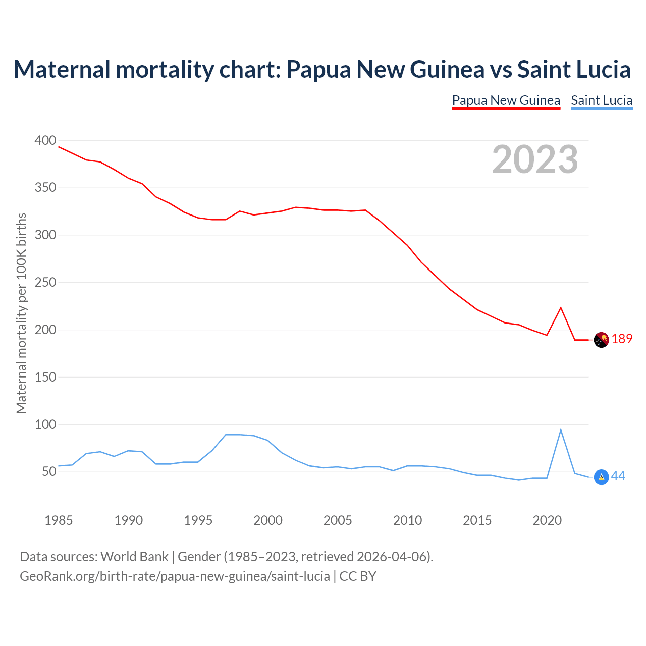 The maternal mortality rate, which is the probability of dying during childbirth or within 42 days of pregnancy termination, is 189 deaths per 100,000 live births in Papua New Guinea, compared to 44 deaths in Saint Lucia.