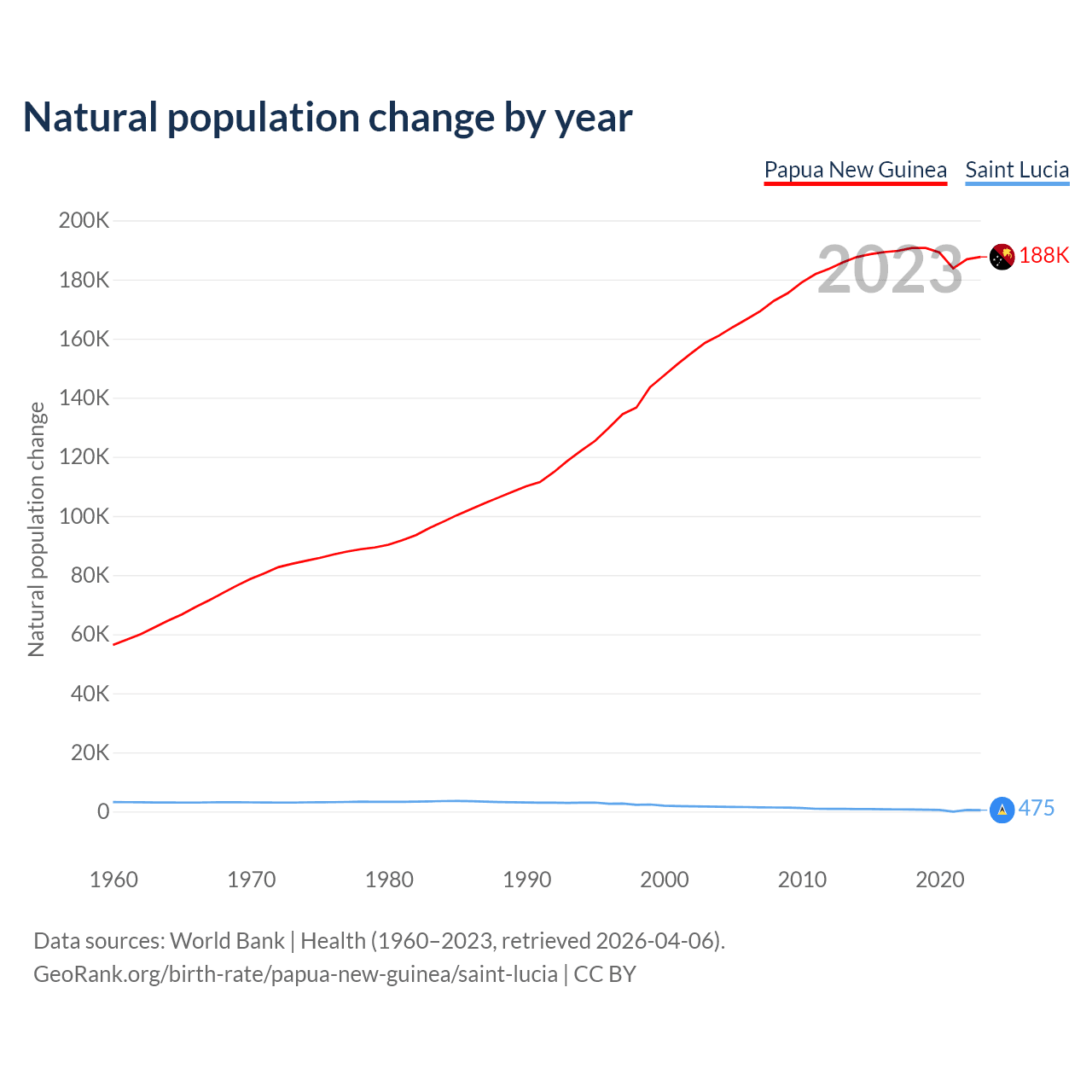 Papua New Guinea has an annual birth rate of 24.6 births per 1,000 people, compared to 11.3 for Saint Lucia. The average number of children a woman is expected to have during her lifetime — the fertility rate, is 3.1 in Papua New Guinea and 1.38 in Saint Lucia — 55.5% difference.