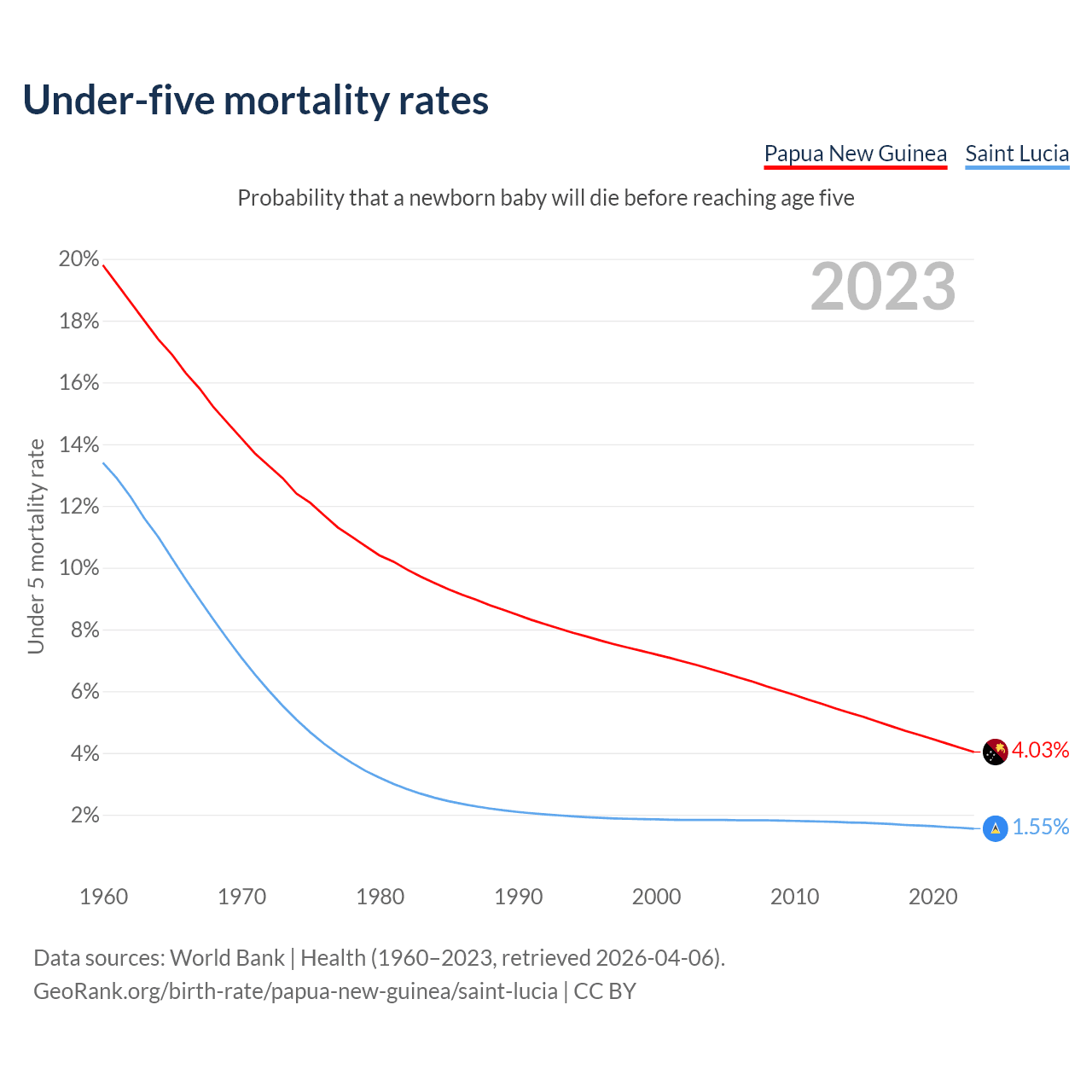 The chance that a newborn baby will die before reaching age five is 4.03% in Papua New Guinea and 1.55% in Saint Lucia. Above is a chart with historical data on under-five mortality rates.