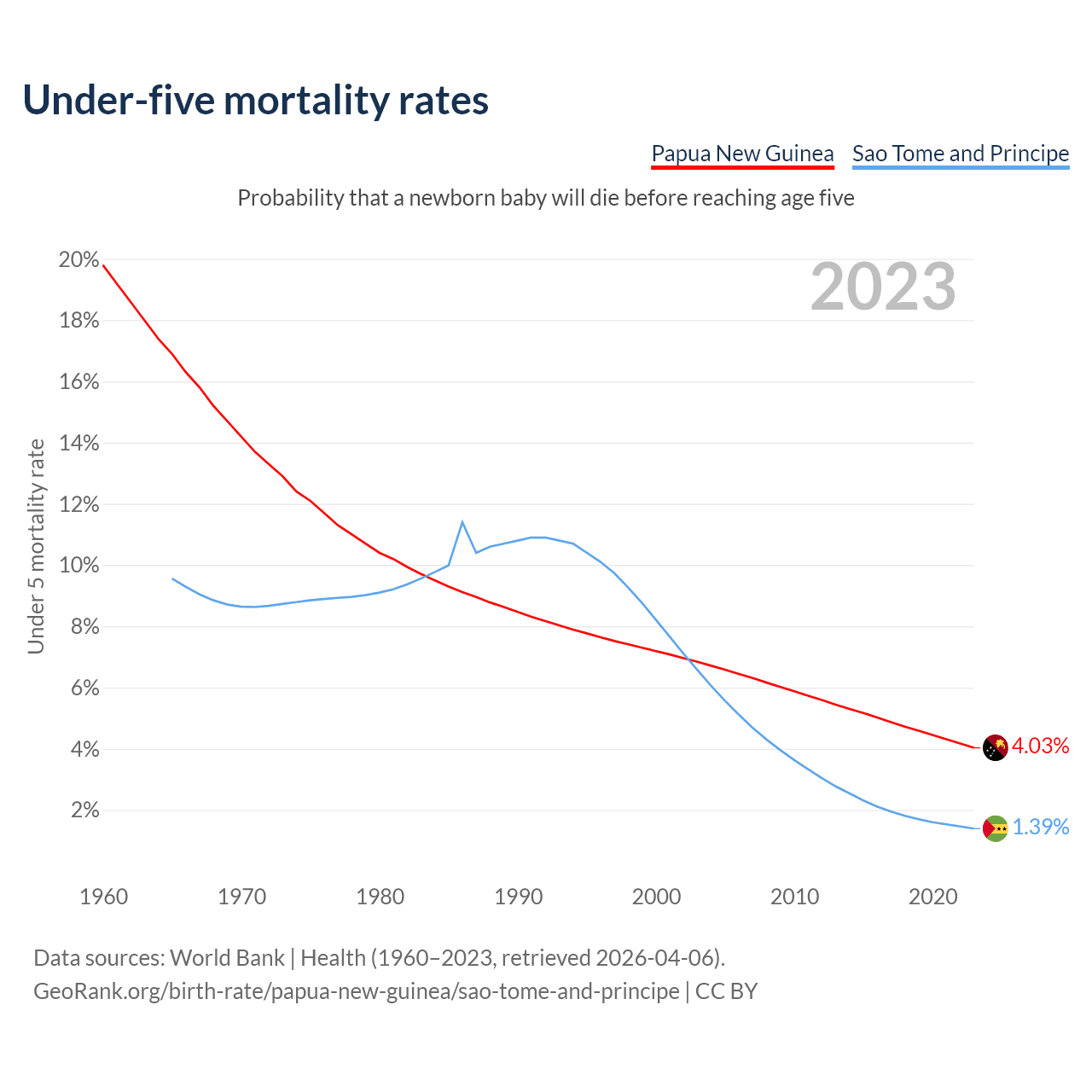 The chance that a newborn baby will die before reaching age five is 4.03% in Papua New Guinea and 1.39% in Sao Tome and Principe. Above is a chart with historical data on under-five mortality rates.