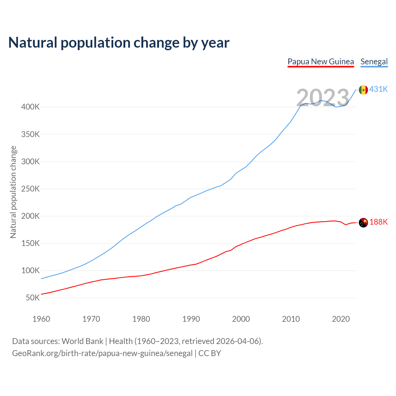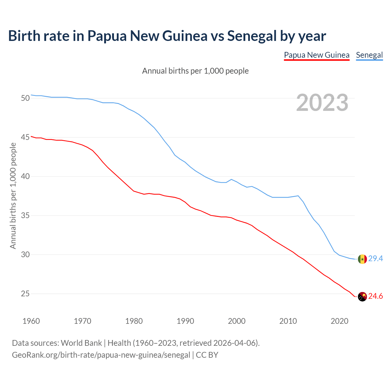 Papua New Guinea has an annual birth rate of 24.6 births per 1,000 people, compared to 29.4 for Senegal. The average number of children a woman is expected to have during her lifetime — the fertility rate, is 3.1 in Papua New Guinea and 3.82 in Senegal — 23.2% difference.