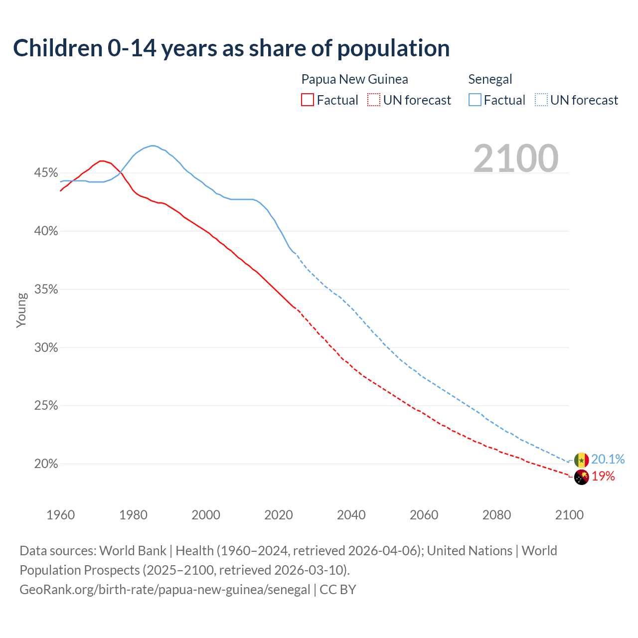 According to the latest available data on birth rates, the fertility rate in Papua New Guinea was 3.1 children per woman in 2023, compared to 3.82 in Senegal in 2023. The replacement level is considered to be 2.1 children per woman.